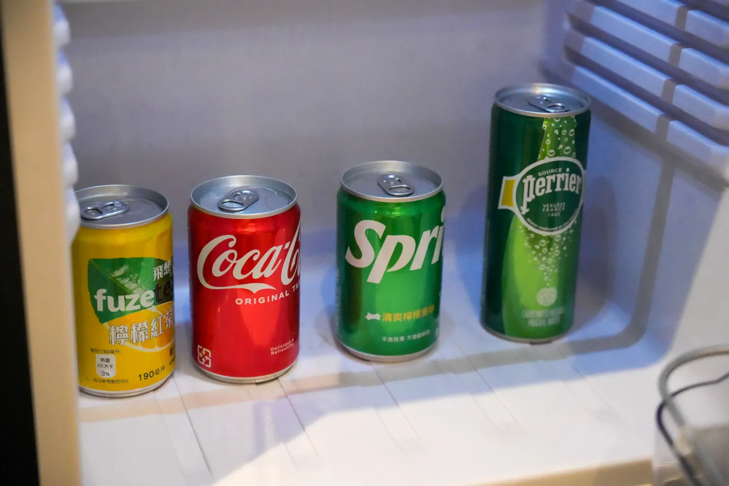 ▼冰箱內則有提供四罐冰飲及兩瓶礦泉水,夏天的高雄真的很需要一些冰冰涼涼的飲品解暑。