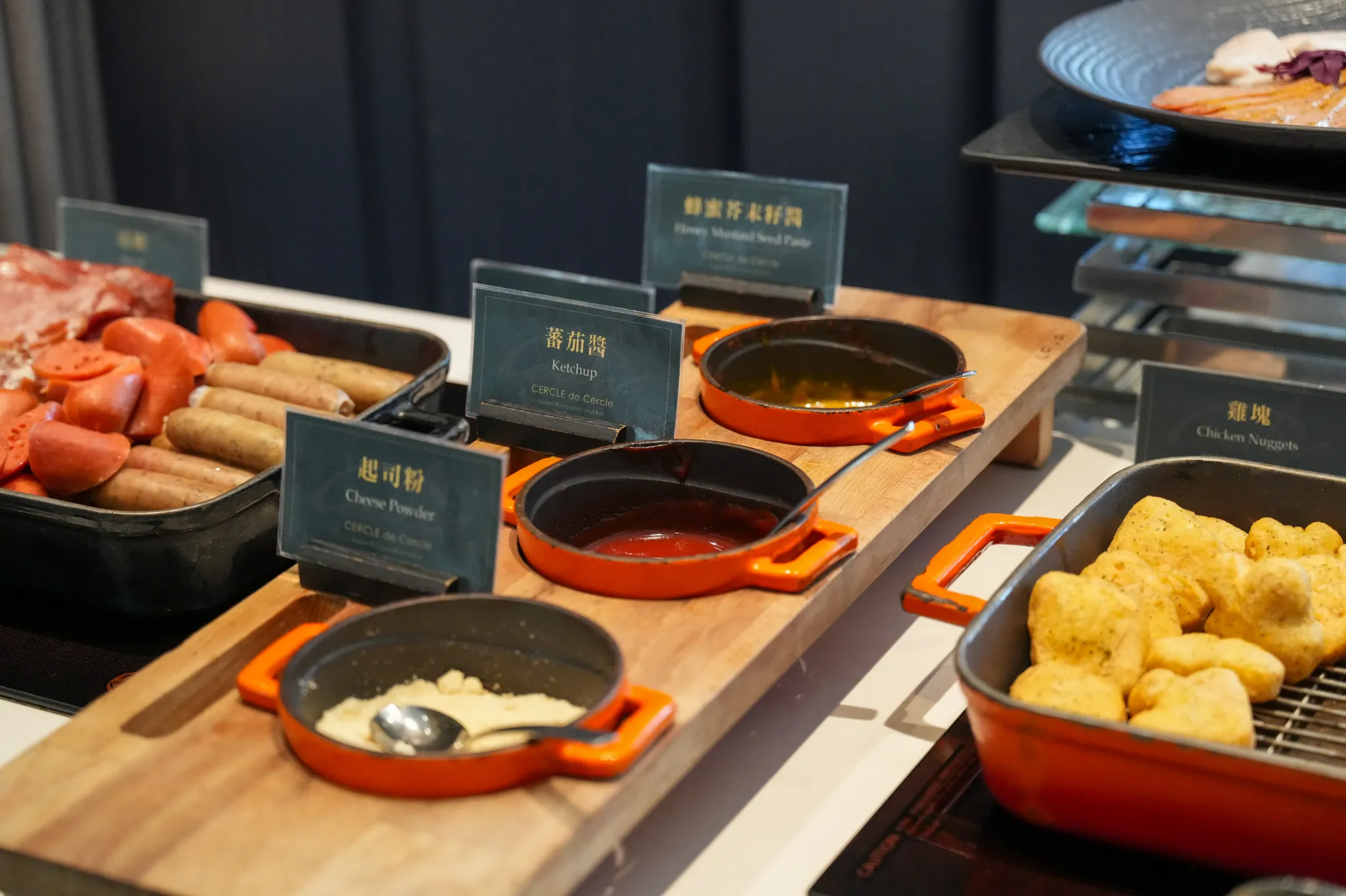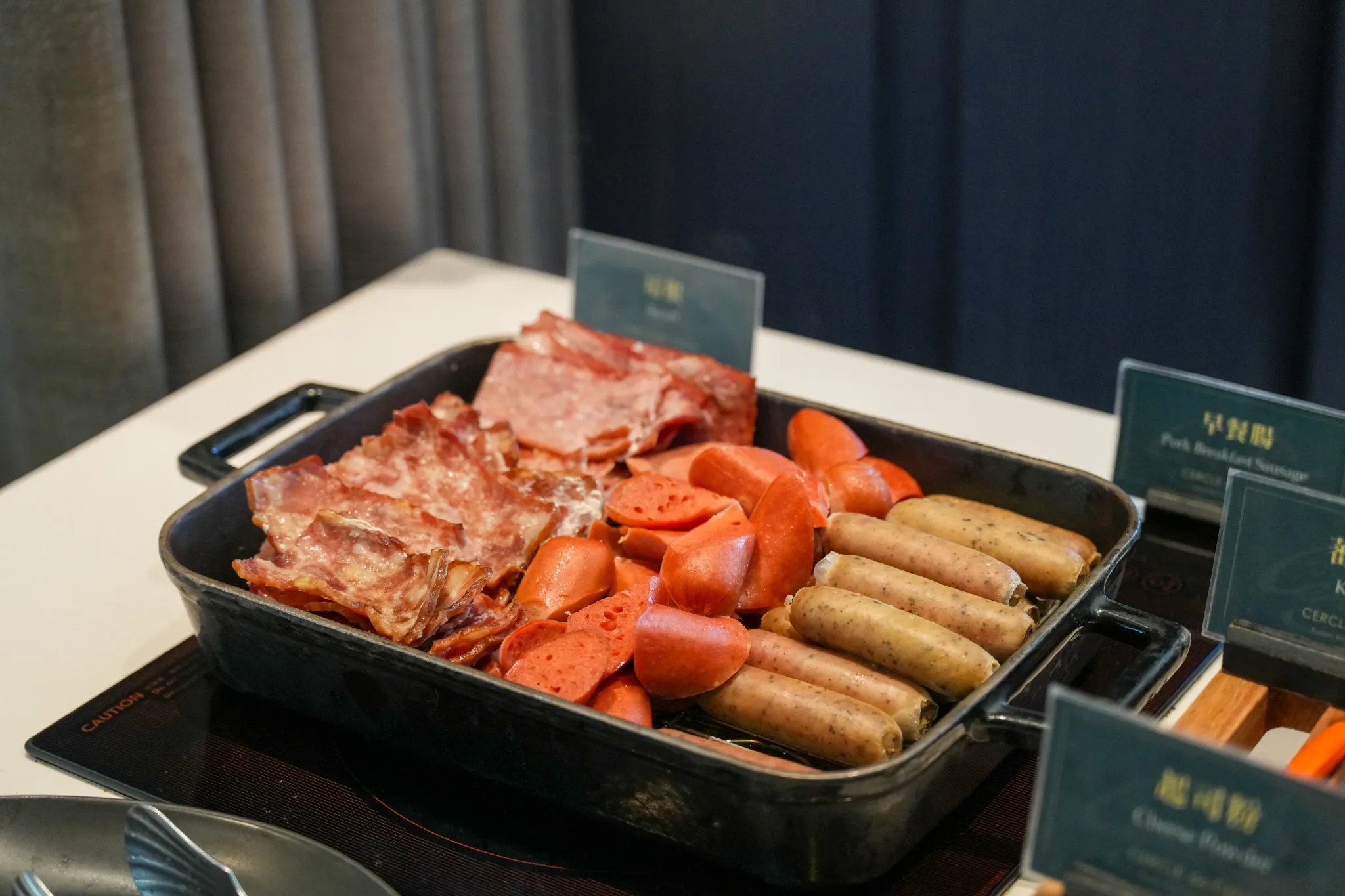 ▼另外還有歐美常見的培根、德式香腸和早餐腸等,可以自由搭配成拼盤,旁邊還有整排的醬料,像是起司粉、番茄醬和蜂蜜芥末籽醬等,想沾什麼就拿什麼。