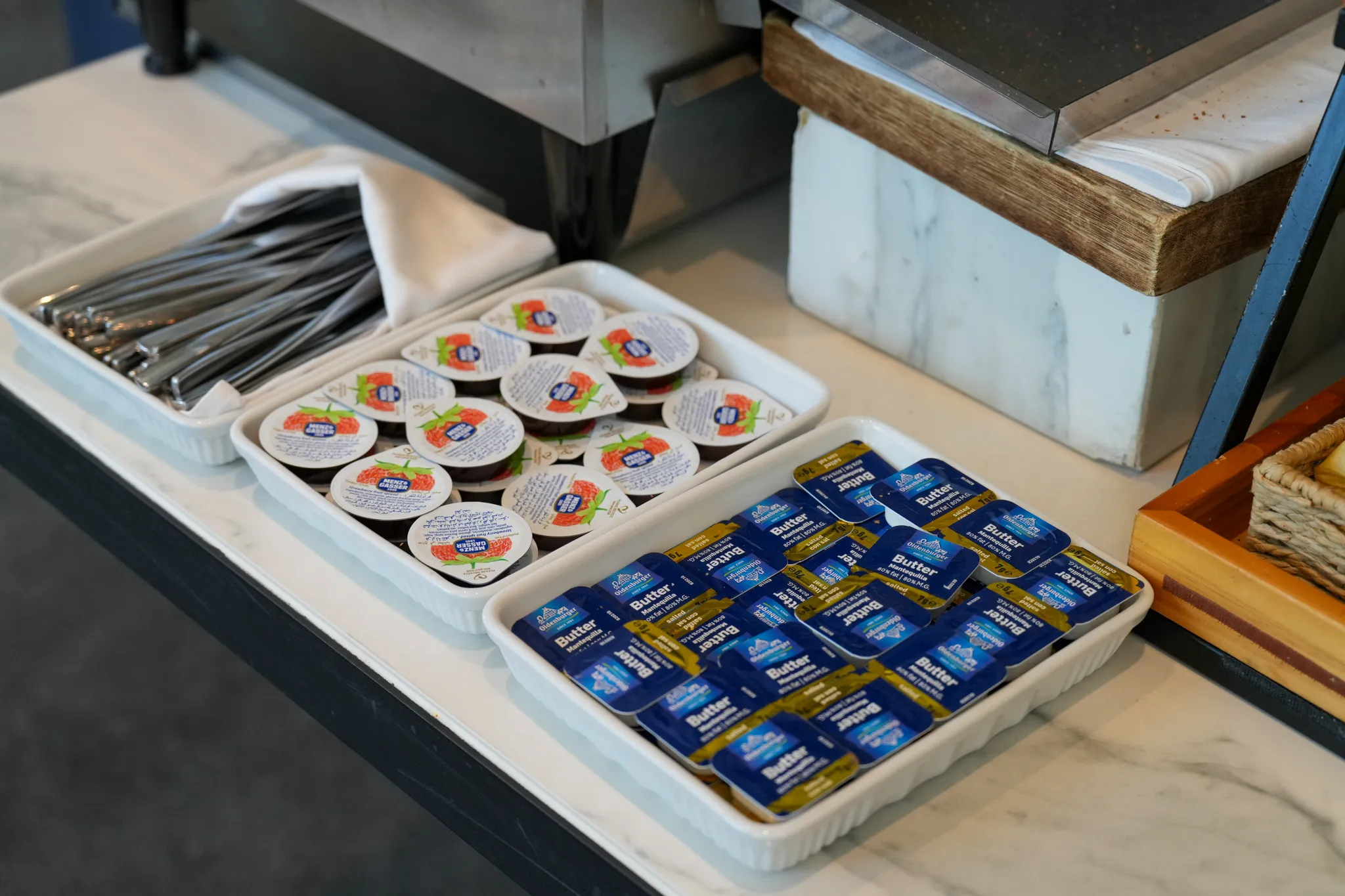 ▼麵包前方則有提供莓果醬及奶油,旁邊則是抹醬刀,可以自由選用塗抹。