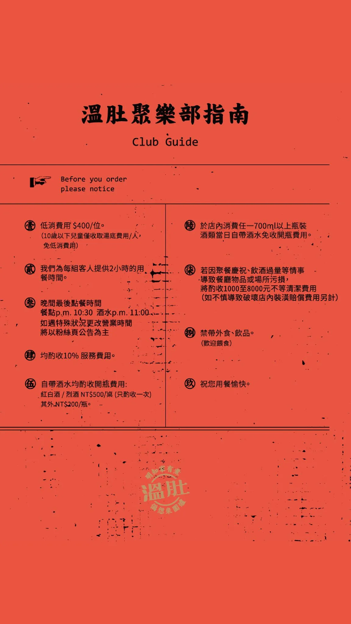 ▼「溫肚火鍋」的低消為400元,用餐時間共2小時,並酌收10%服務費,且禁帶外食、飲品。