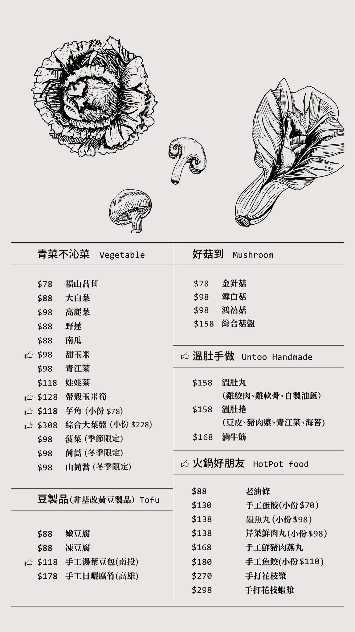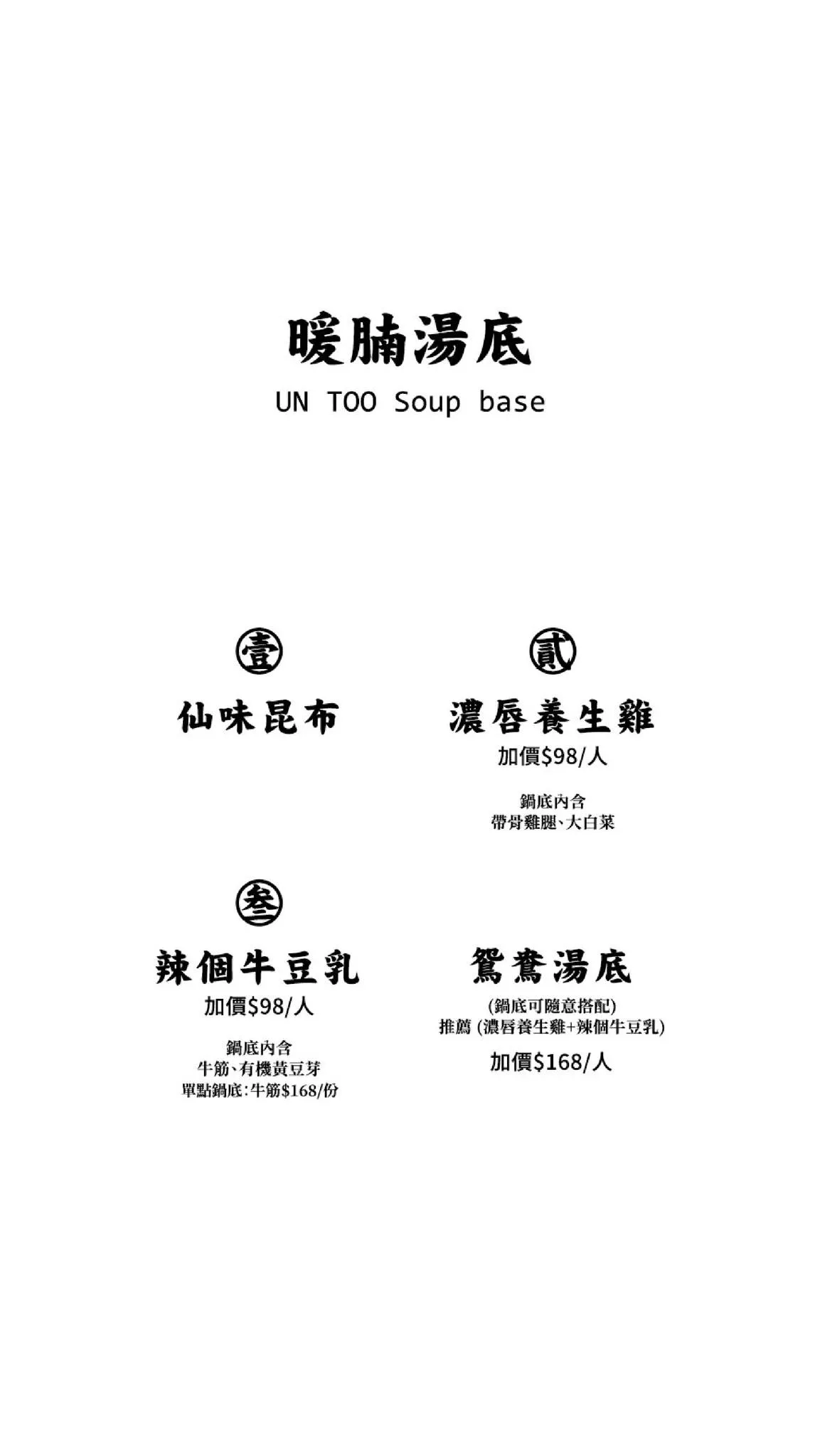 ▼「溫肚火鍋untōo」的菜單分成湯底、單點品項、肉品、海鮮和副餐、酒單、甜點、飲料以及套餐等,初次用餐店員會幫你做詳細的介紹,菜單上也會有一些食材照片提供參考,還有搭配小插畫,極具特色。