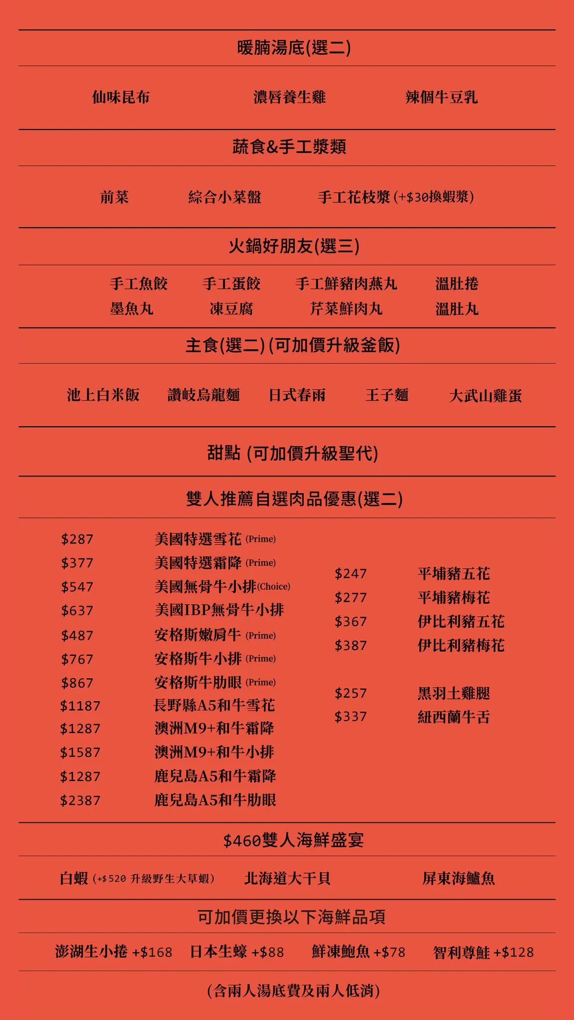 🍲雙人套餐 $1451 (含兩人湯底費、低消)