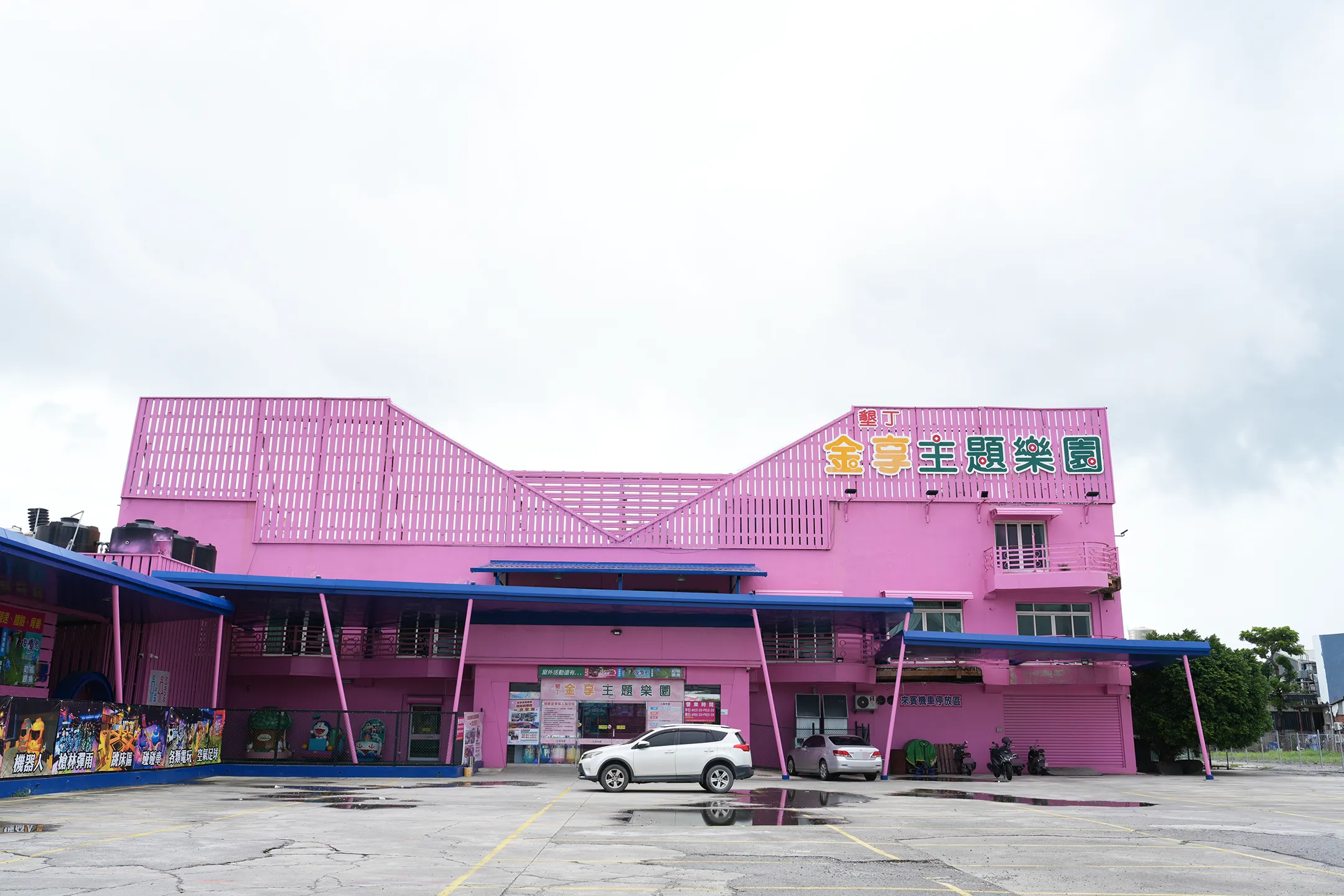 ▼主題樂園的外觀同樣也是亮眼的粉紅色,外面空地有畫停車格可以免費停車。