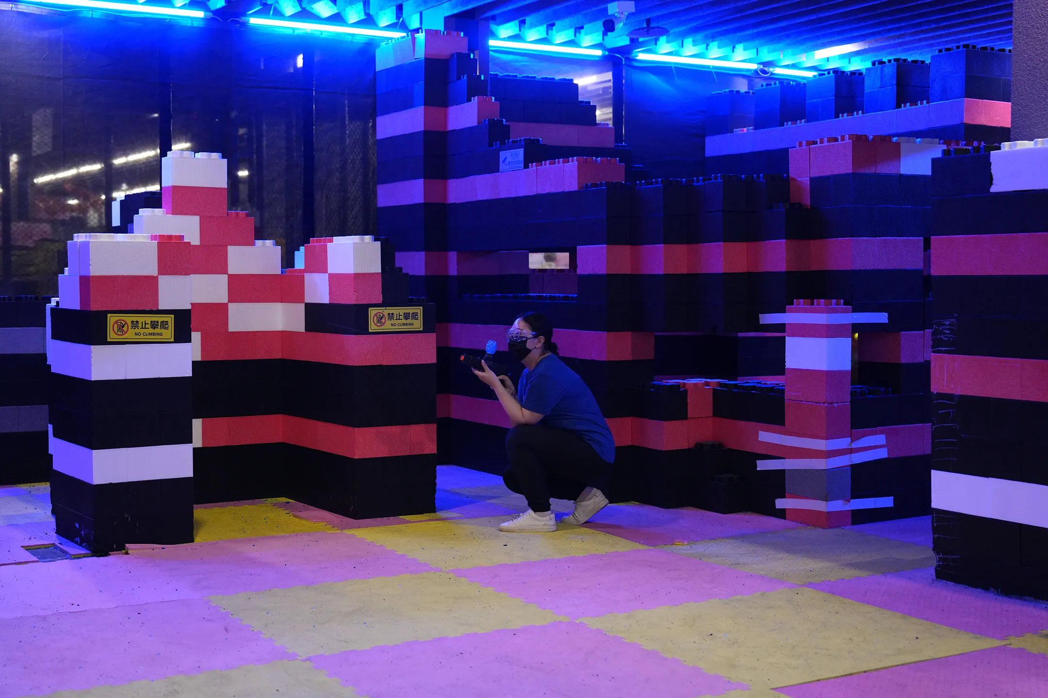 ▼這一區會有許多高矮的樂高形狀的遮蔽物,環境也營造的很有氛圍,可以躲在牆後伺機攻擊對手,BB彈打到身上會有一點點痛,防護措施有做好的話就不用太擔心,另外我發現BB槍還滿容易卡彈的,如果發現卡彈的狀況,可以去入口處請店員幫你換一把新的槍。