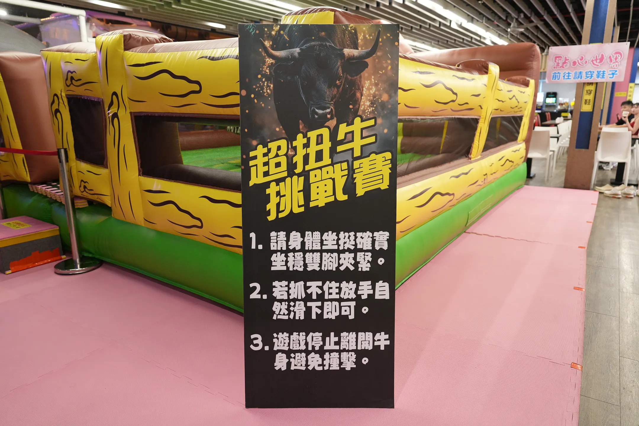 ▼要玩「瘋狂牛」需要先通知店員來開啟設施,同時也會說明安全注意事項,要把身體坐挺,雙腳夾緊,訣竅的話就是要隨著牛擺動時改變重心跟姿勢,但實際下去玩發現真的不容易啊,完全掌握不到訣竅,我真的超快就被甩下來了,推薦給喜歡刺激遊樂設施的人。