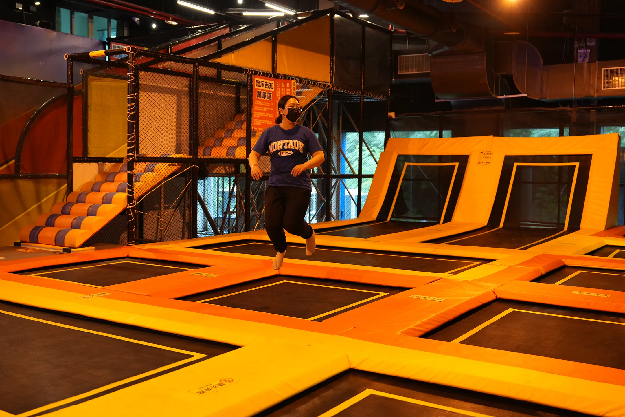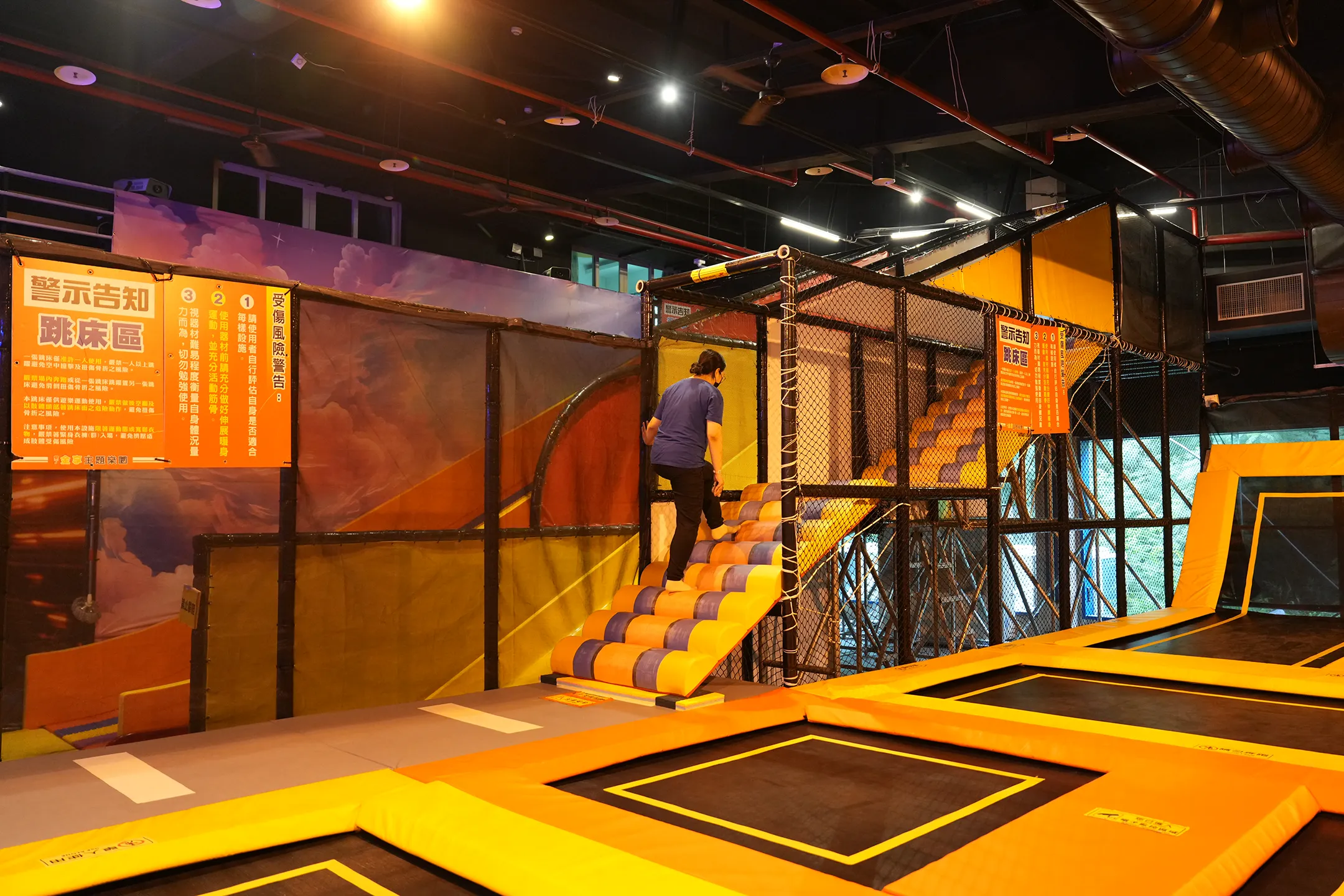▼「跳床」絕對能喚起每個人的童年回憶!這裡設置了多張專業級彈跳床,為了安全考量,每張跳床限制只能一人使用。彈跳的高度相當驚人,失重的刺激感讓人欲罷不能!不過要特別注意,當想停下來時千萬要循序漸進地減速,因為彈力真的很強,如果突然煞車很容易重心不穩而跌坐在跳床上。