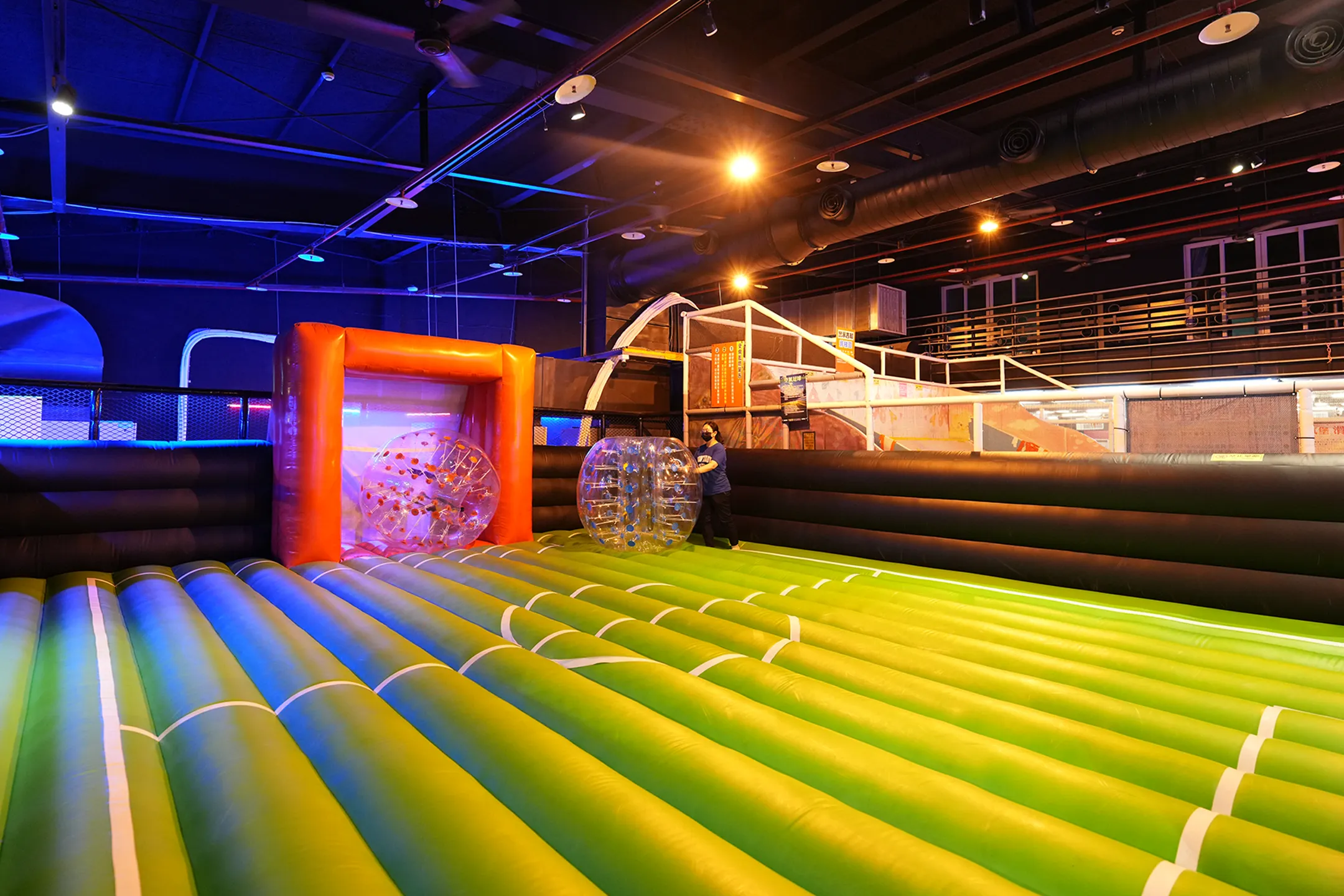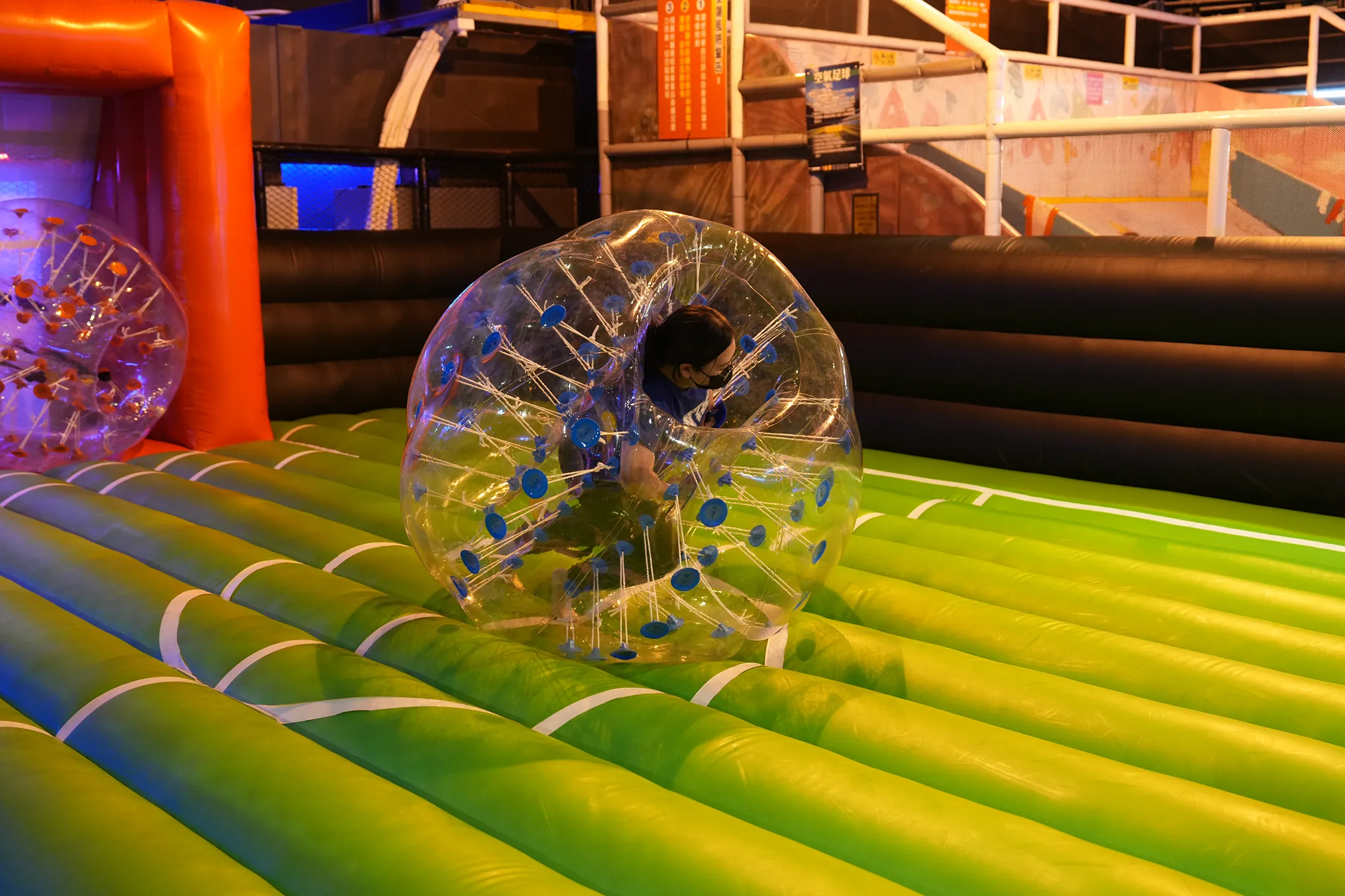 ▼「空氣足球」是一項適合兩人對戰的趣味設施,玩法是將身體鑽進透明的充氣球裡,只露出雙腿在外。穿上這身「防護罩」後,就可以毫無顧忌地朝朋友衝撞過去,整個人被彈開又翻滾的瞬間真的超級有趣!