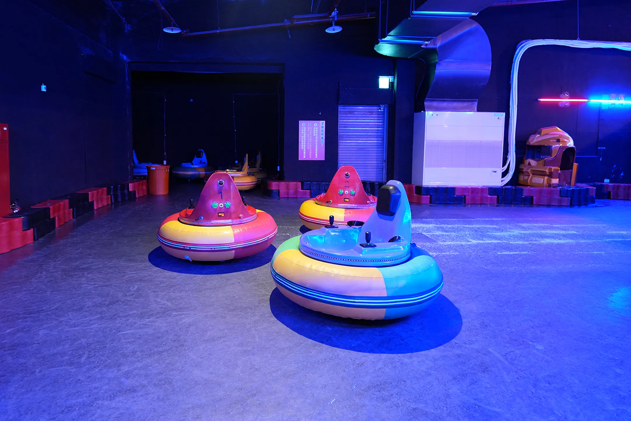 ▼「碰碰車」需由工作人員統一啟動後才能開始遊玩。由於車體外圍包覆著軟墊材質,碰撞時的衝擊力道相當溫和,不會有強烈的撞擊感,是大人小孩都會愛上的經典遊樂設施。