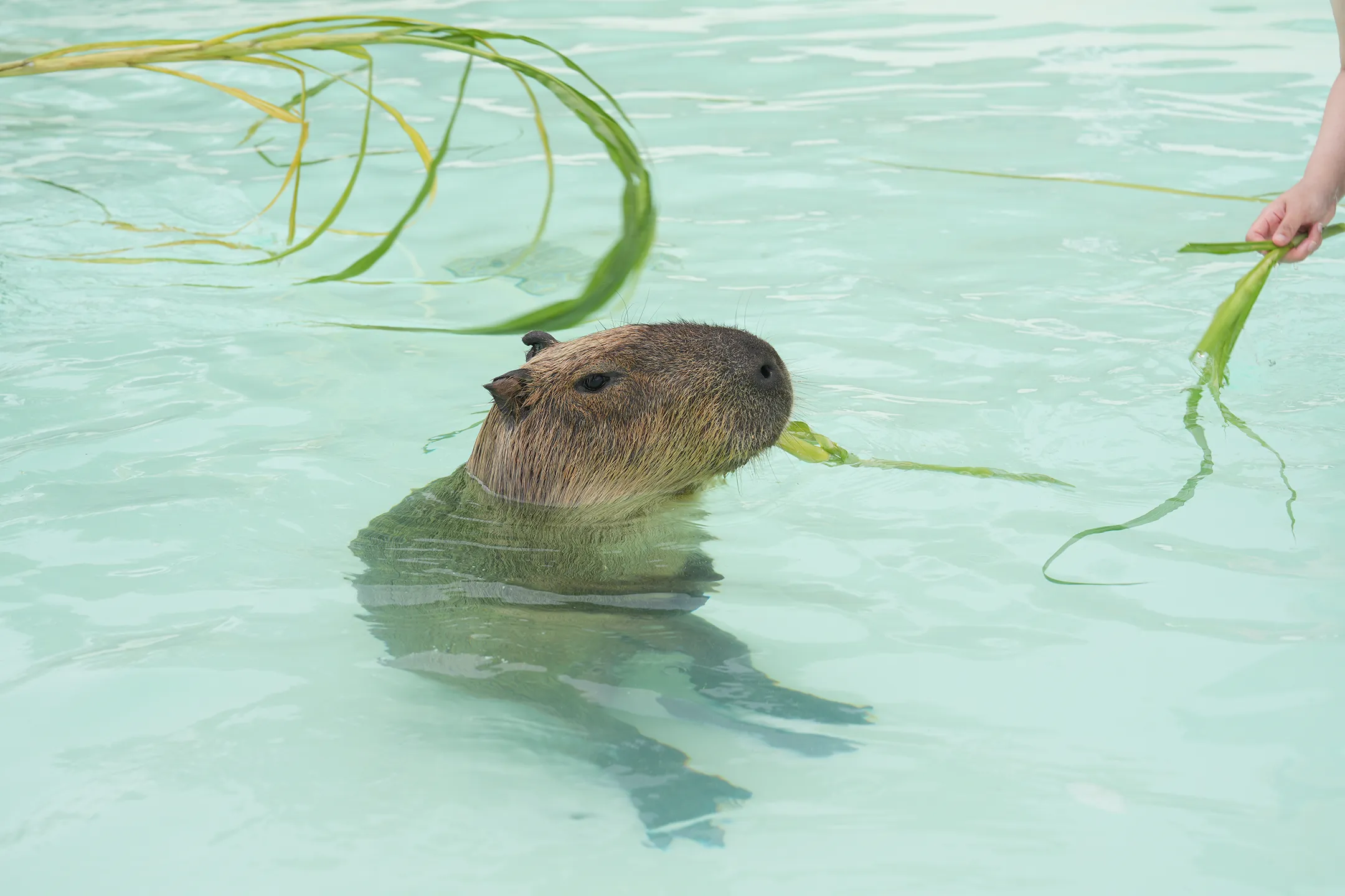 ▼下水體驗前,遊客需要先填寫資料。接著,專業教練會詳細講解與水豚互動時的安全注意事項。由於水豚屬於齧齒類動物,具有鋒利的門牙,互動時應避免將手指過於靠近牠們的嘴部,以免發生意外咬傷。在餵食體驗時,教練會提供新鮮的牧草,當牧草被啃食到較短長度時,建議就不要繼續餵食,這樣可以避免手指不小心觸碰到水豚的牙齒。