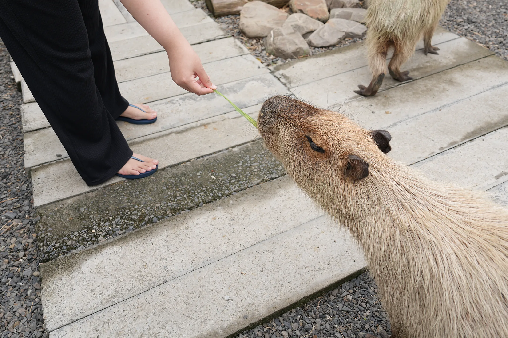 ▼超萌的水豚吃起牧草來,不會像其他動物那樣瘋狂搶食,而是一派悠哉的樣子,慢慢地咬、慢慢地嚼。雖然看起來很佛系,但其實吃得超認真,會把每一根草、每一片葉子都吃得一乾二淨,完全不浪費。看著牠們圓滾滾的身體、呆呆的小眼神,配上那認真吃草的模樣,真的可愛到不行。最讓我驚訝的是,當手掌真正觸碰到水豚的瞬間,才發現牠們的毛髮竟然比想像中硬很多!摸起來粗粗的、刺刺的,質地有點像豬鬃刷。