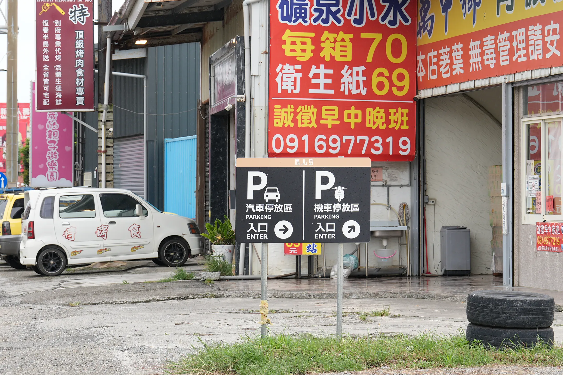 ▼有小告示牌指示停車場的位置,但這個告示牌有點不起眼,尺寸也有點小,反而後面的廣告招牌更顯眼。