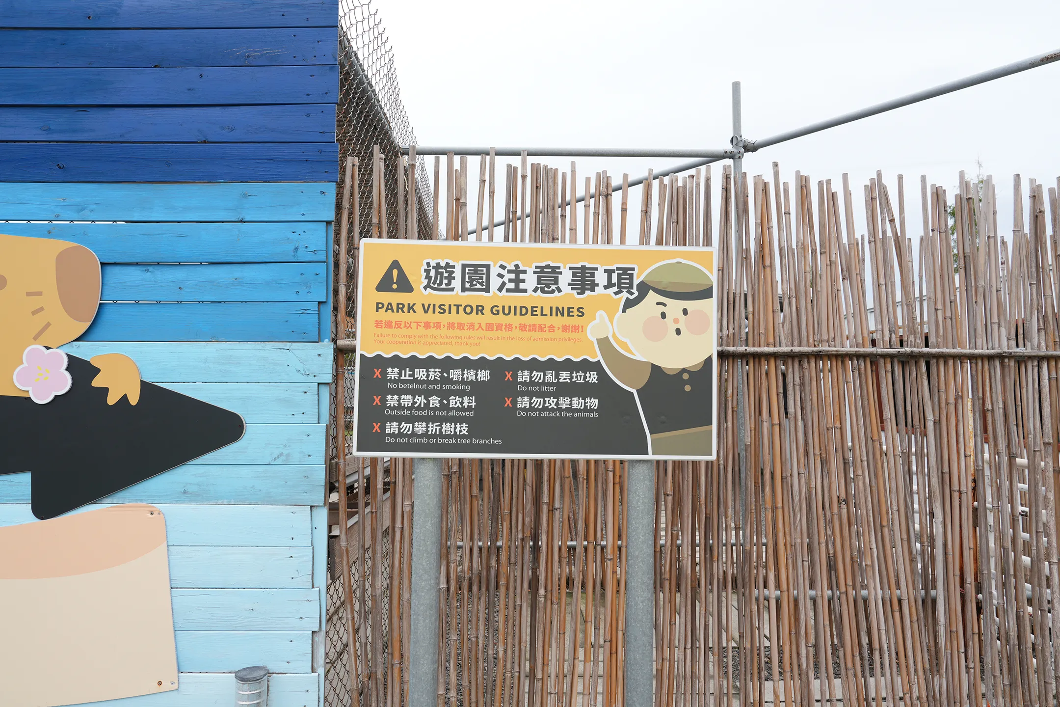▼進入動物區之前,入口處的告示牌清楚標示著各項注意事項,提醒遊客不可攻擊動物、禁止亂丟垃圾、禁帶外食/飲料等重要規定。