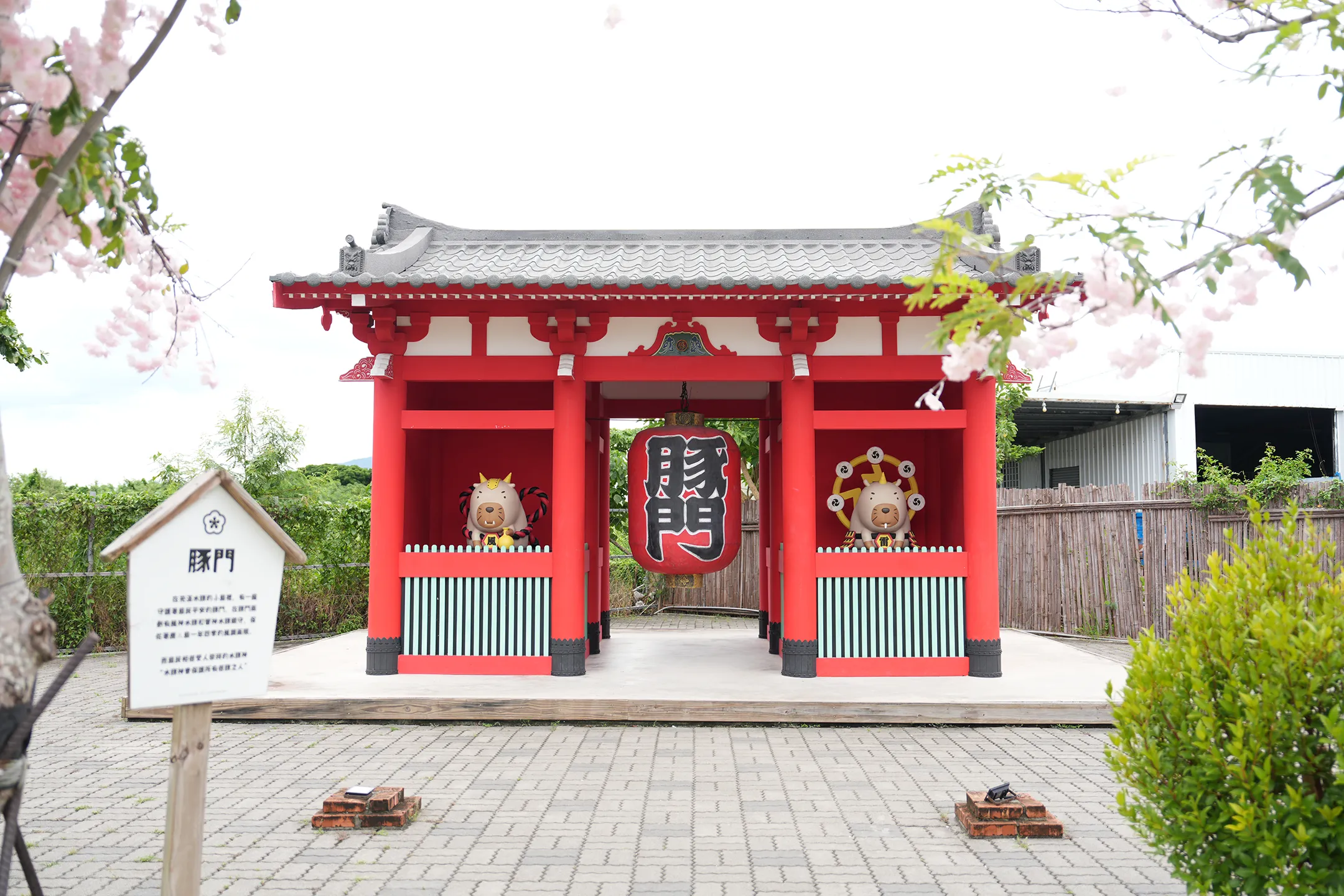▼仿照日本東京淺草寺雷門設計的縮小版豚門,是園區最大的拍照亮點。大紅色的豚門兩側還有可愛的水豚守護神坐鎮,非常適合拍照打卡,是園區必拍的地標性建築。