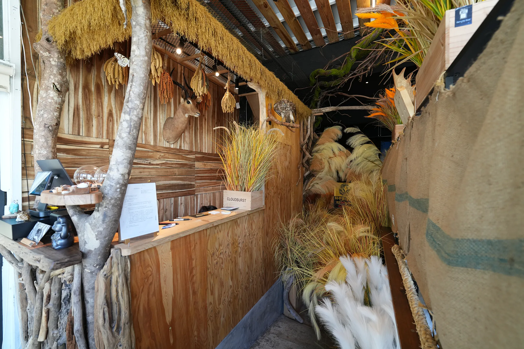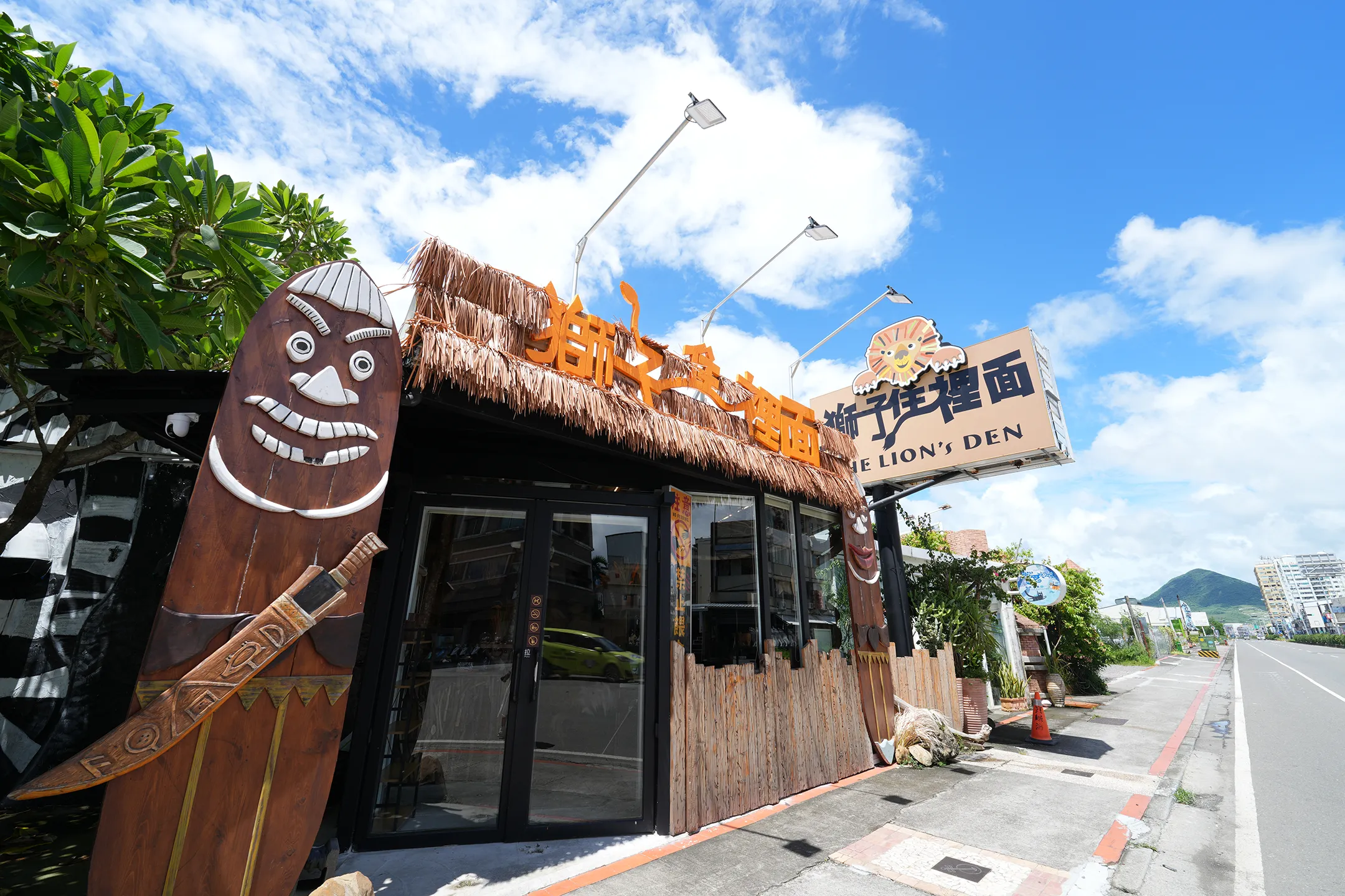 ▼「獅子住裡面」的店門口上方招牌以茅草裝飾,整體外觀就像一棟小木屋。最吸睛的是旁邊佇立著原住民風格的木雕人像,充滿濃厚的非洲部落文化氣息。