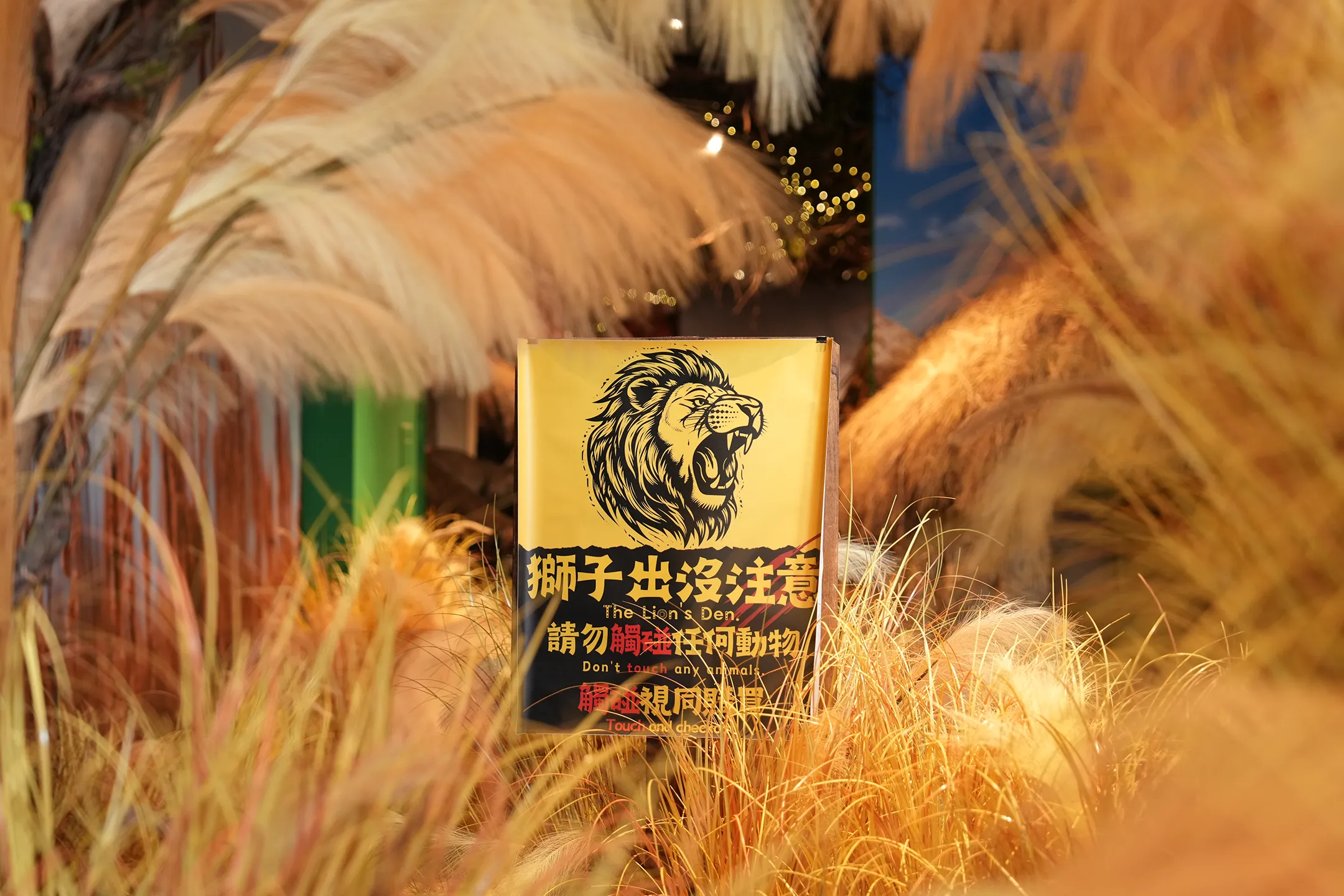 ▼穿過層層草叢後,眼前突然出現一塊「獅子出沒注意」的告示牌,瞬間營造出危機四伏的氛圍。這樣的設計讓整個參觀體驗更加刺激有趣,彷彿真的踏入了野生動物的領地,讓人既期待又帶著些許緊張感。