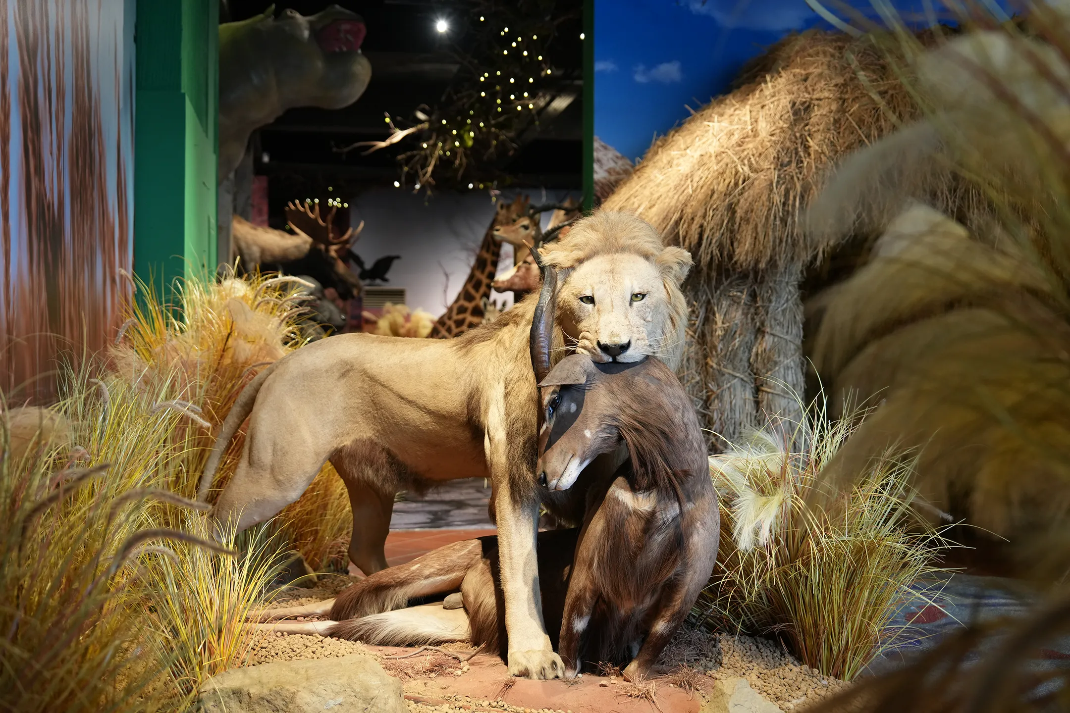 「獅子住裡面」展出的並非模型,而是真實的標本。雖然整體空間不大,大約半小時就能逛完,但展出的標本數量相當多。一進場就被獅子叼著羚羊的場景震撼到,那銳利的眼神即使知道是標本還是讓人心跳加速。所有標本都是1:1等比例製作,長頸鹿、斑馬、河馬、非洲水牛近在眼前,從皮膚、毛髮到動物們的眼神,都相當栩栩如生。