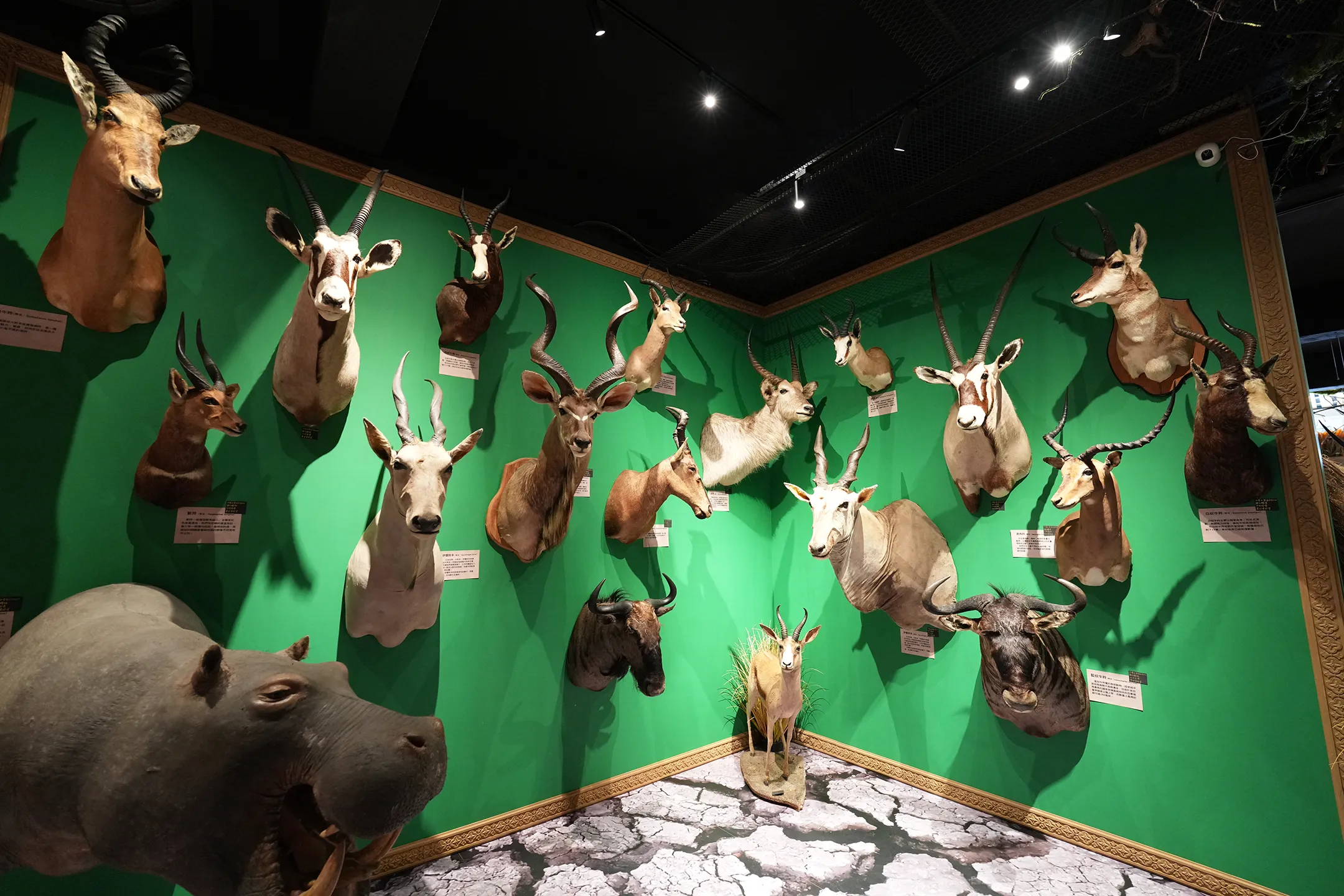 ▼下一展區以綠色牆面為背景,展示了豐富的羚羊標本收藏。這些羚羊標本整齊排列,每件作品下方都配有說明牌,清楚標示物種資訊與標本價值。透過這面展示牆,才發現原來羚羊科動物的種類遠比想像中多樣,不同品種的羚羊在角的形狀、體型大小、毛色花紋上都各有特色,讓人忍不住一一細看比較。