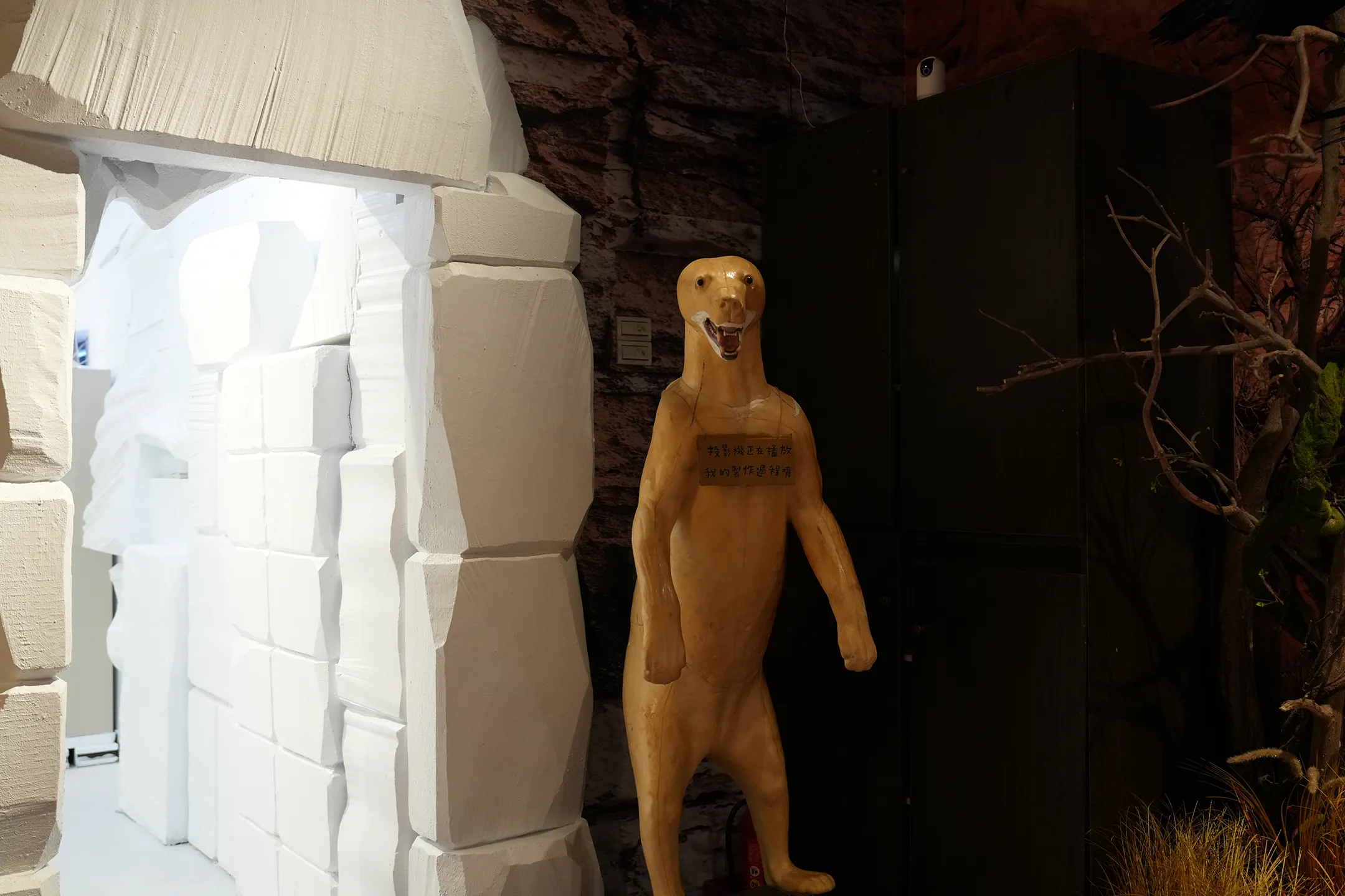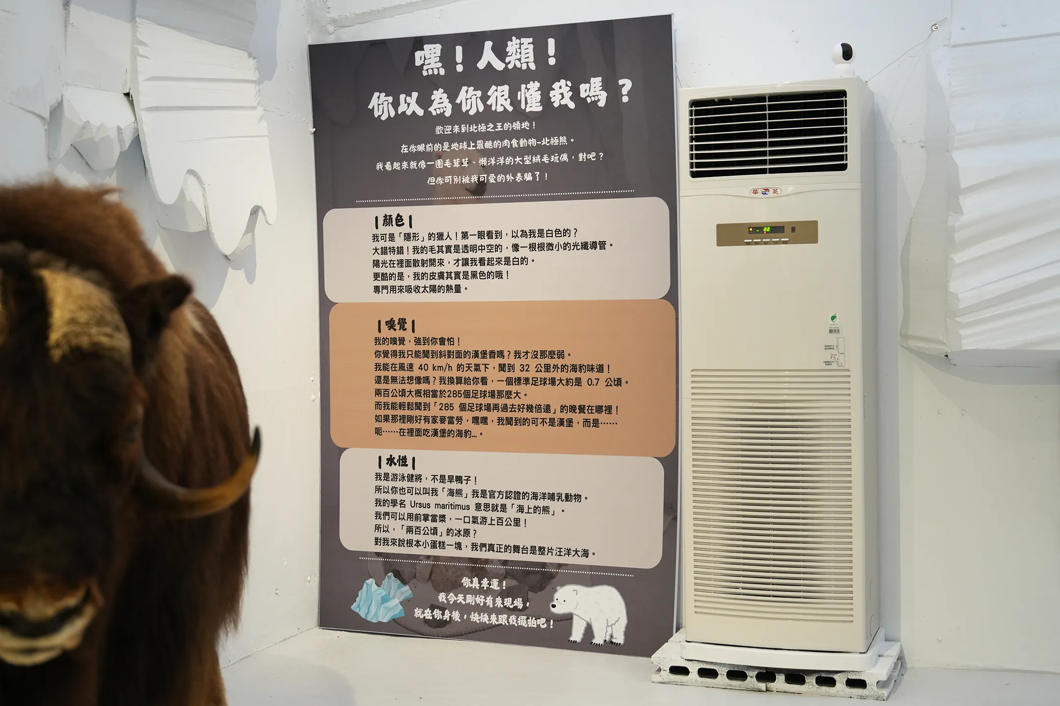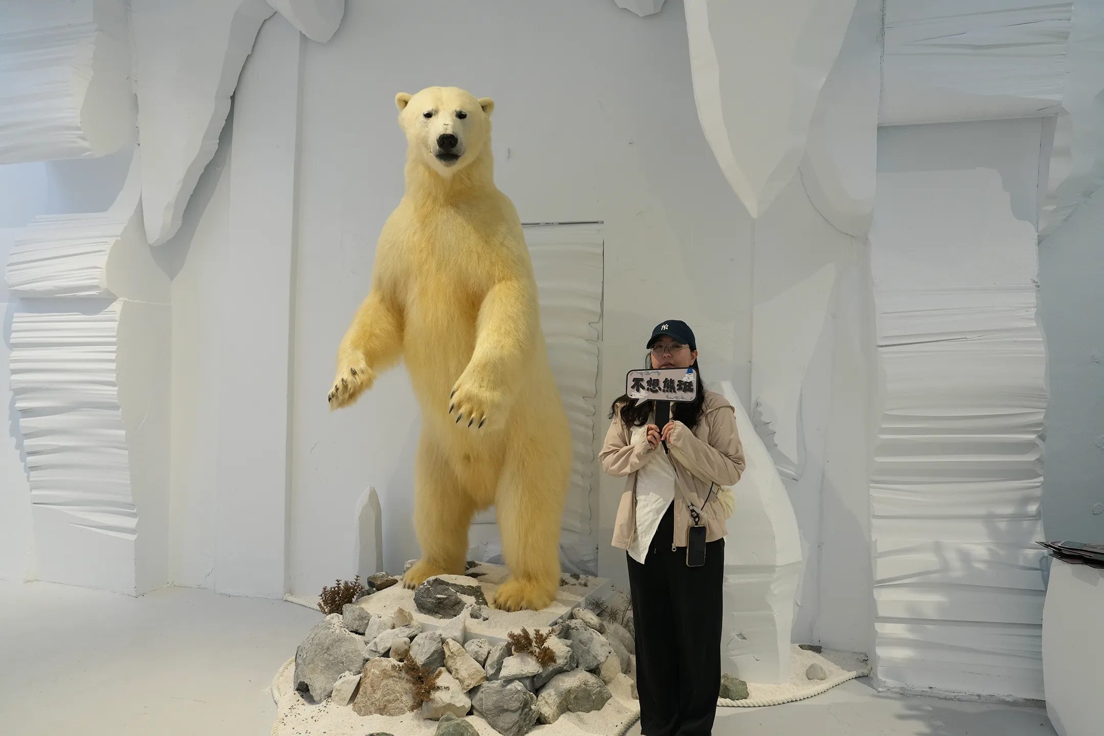 ▼極地區最吸睛的就是這隻巨型北極熊標本!由於採用1:1真實比例製作,我站在旁邊對比之下顯得特別嬌小,更能體會北極熊的龐大體型。現場還提供多款打卡牌讓遊客拍照留念,是個超熱門的拍照景點!
