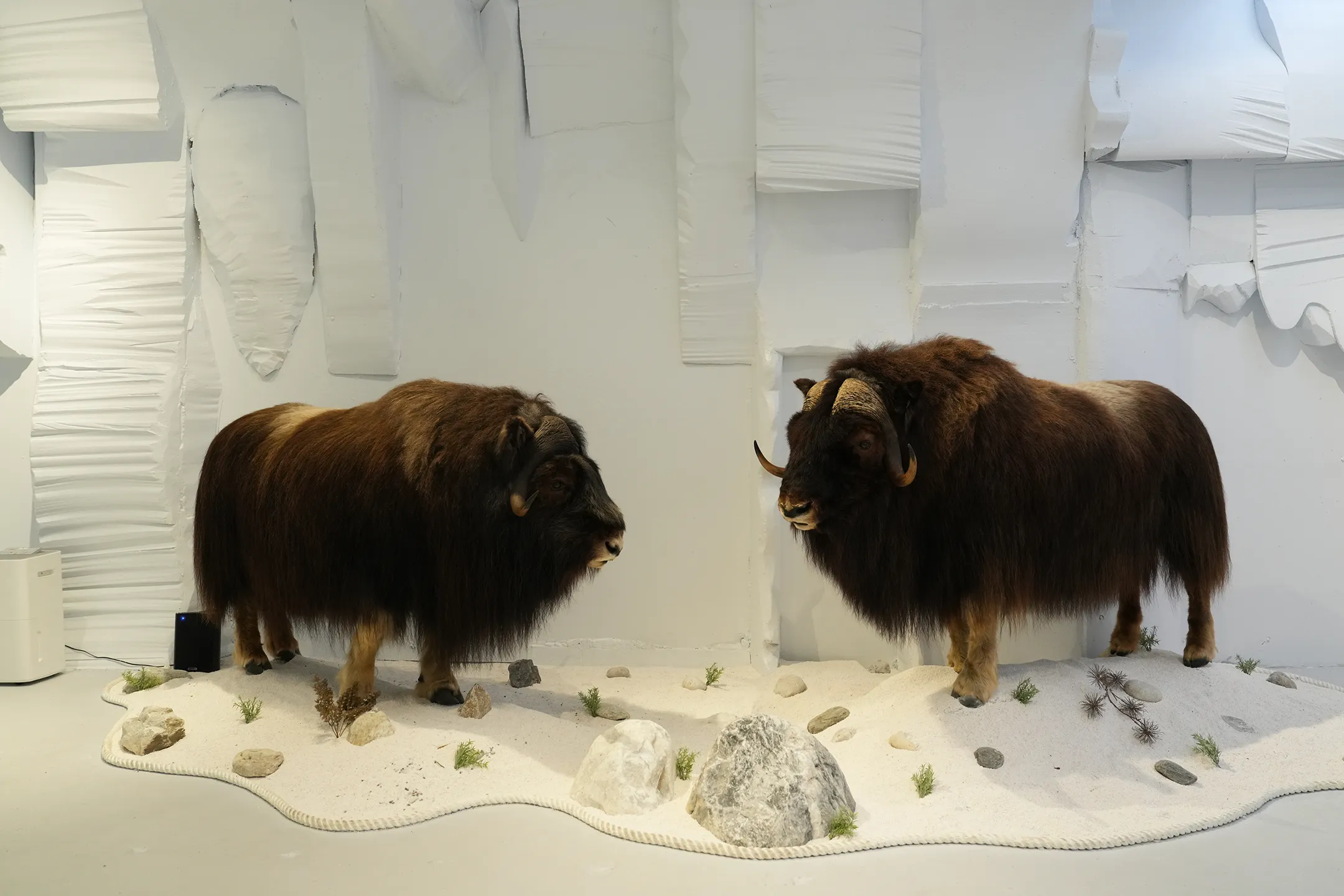 ▼來到極地氣候區,首先遇到的是麝牛,外型介於牛羊之間,但生活習性其實更像羊,是北極地區體型最大的草食性動物。為了適應高緯度的嚴寒氣候,麝牛演化出雙層厚實的皮毛,無論雌雄都長有又寬又大的角,而身上那些傾斜垂落的長毛更有巧妙設計——能讓積雪順勢滑落,避免堆積在身上增加負擔。