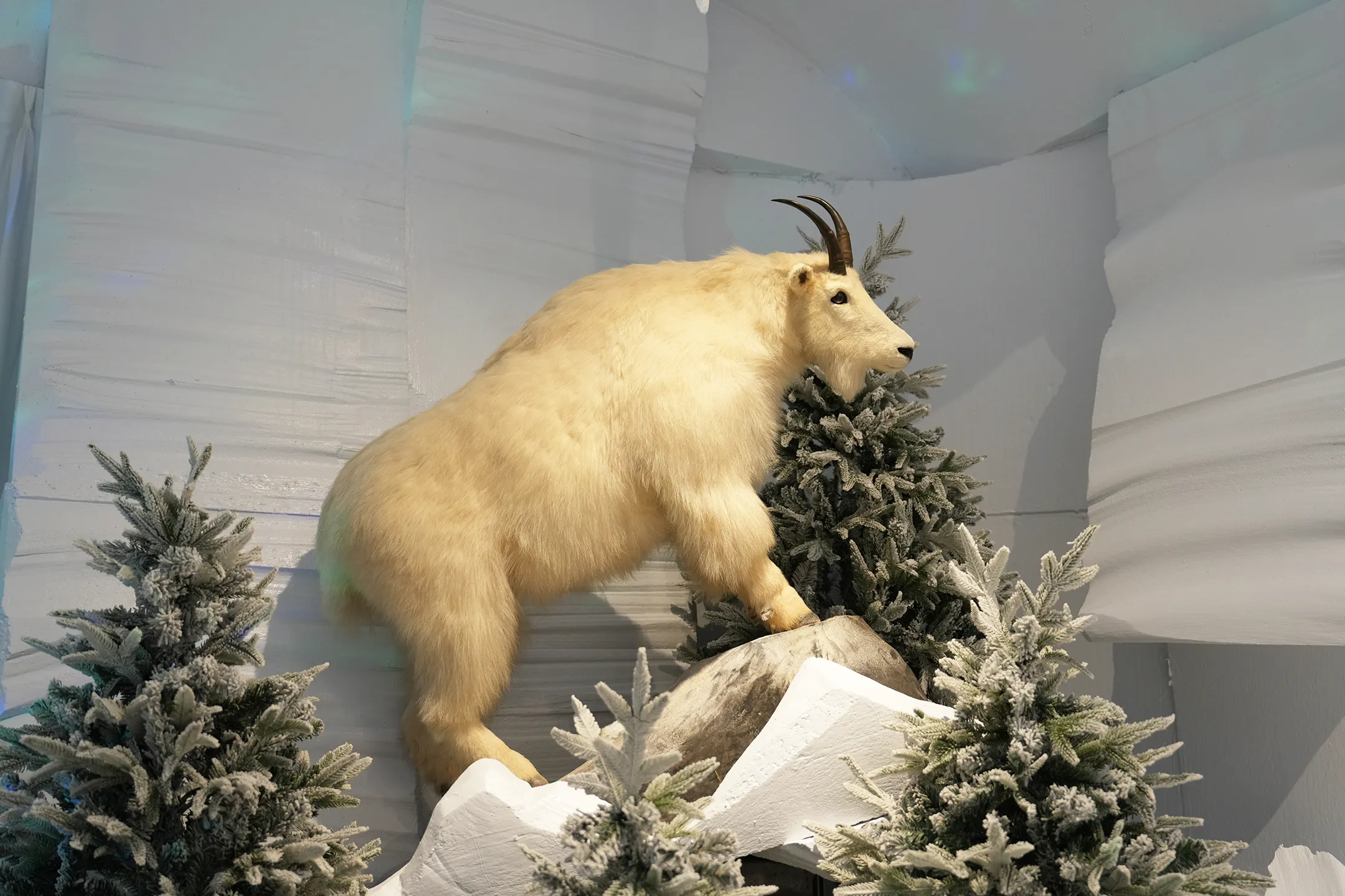 ▼除了北極熊之外,館內展示的落基山高山羚羊標本也讓我印象深刻。這種羚羊因長年生活在陡峭的山區,四肢十分強健有力,能靈巧地攀上岩壁。館方特別為牠設計了一個仿山地的展示場景,從岩石層次到姿態動作都十分逼真,彷彿能感受到牠在高山間矯健跳躍的英姿,更突顯出這種動物的堅韌與生命力。