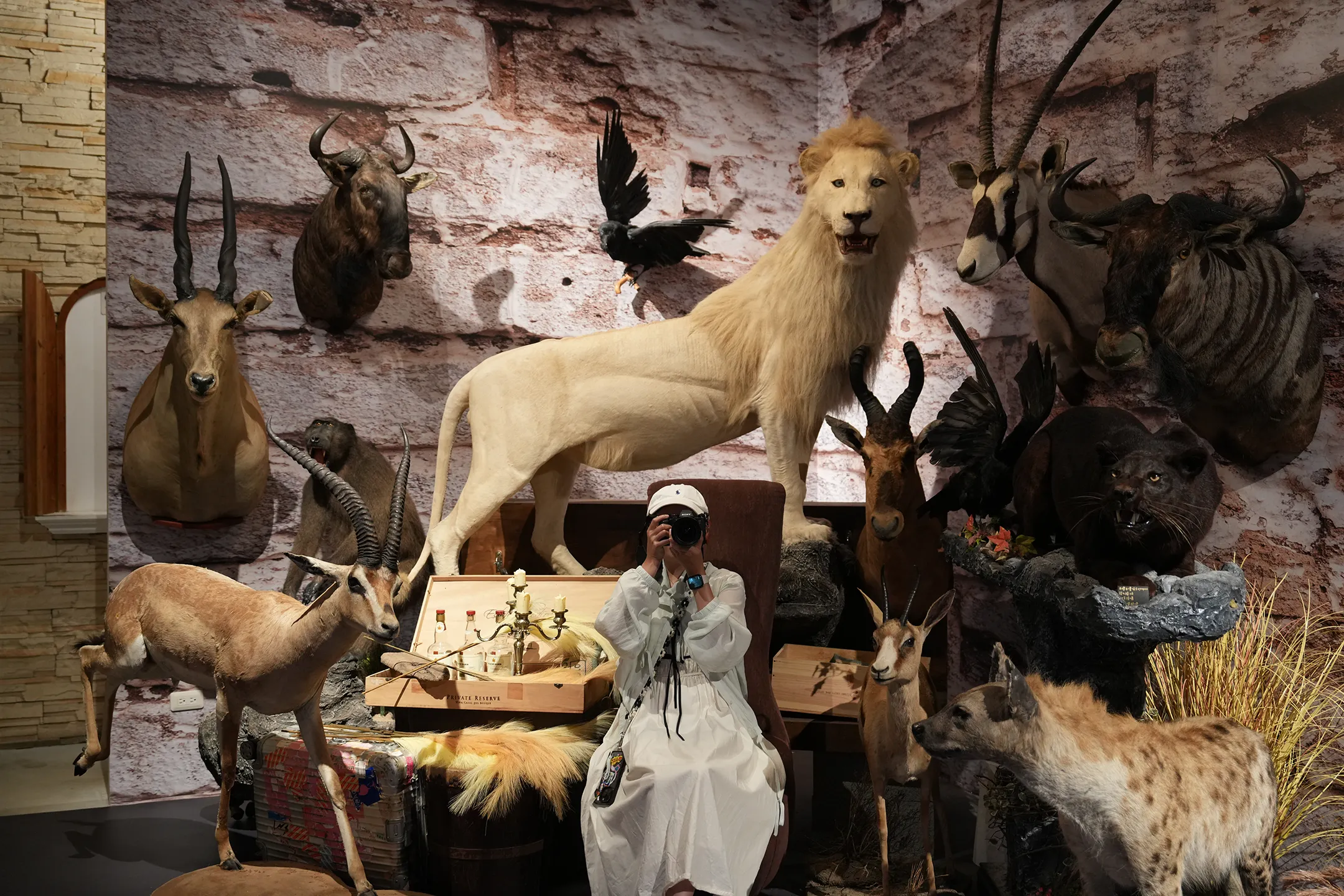 ▼第一個打卡點是以非洲草原實景為背景,配上復古風格的老爺車,車後設有拍照平台,兩側是長頸鹿與斑馬標本。站上平台取景,瞬間營造出駕車馳騁在非洲大草原的探險氛圍,是個超好拍的場景!
