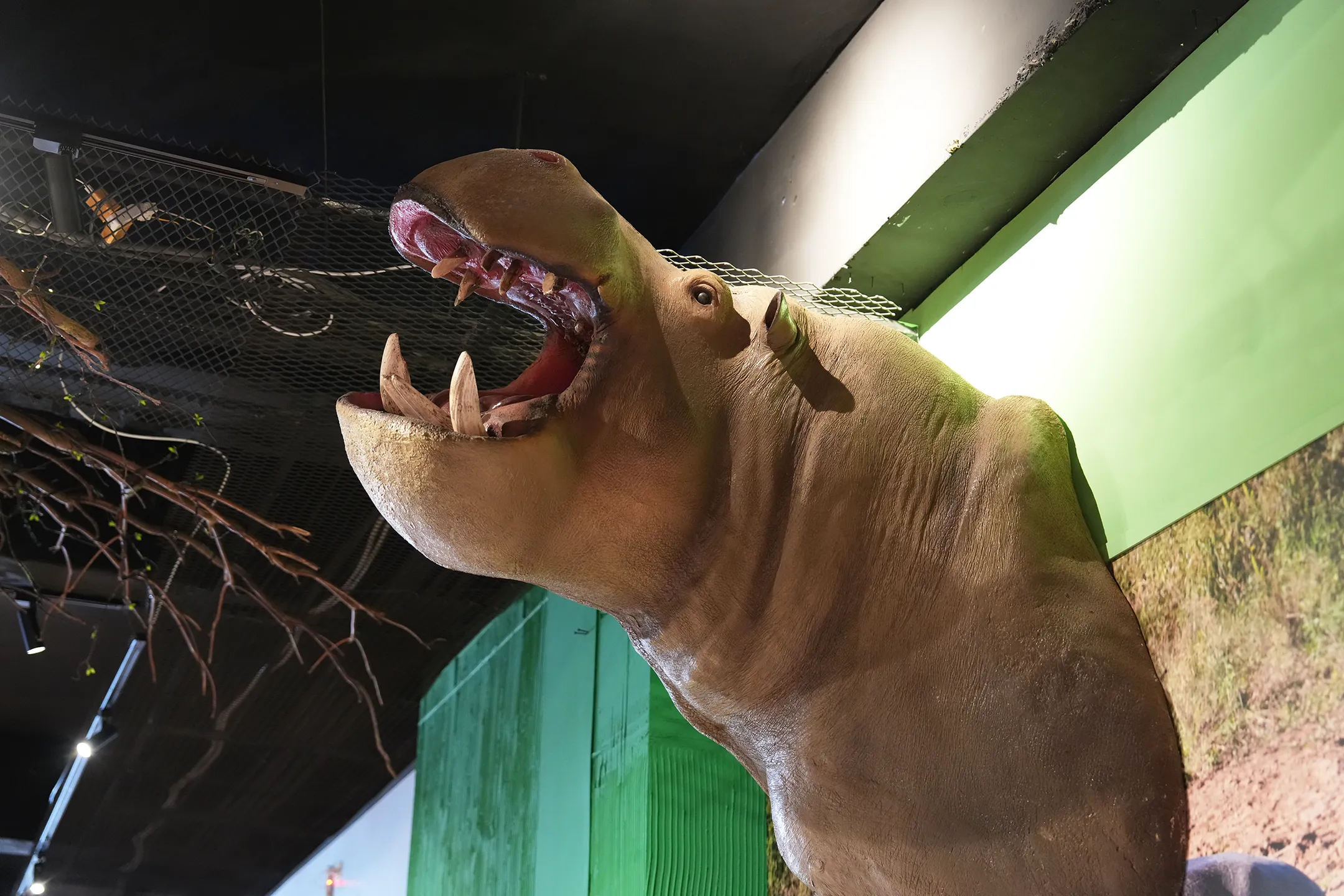 ▼遇到我們的河馬同類了!近看才知道河馬的體型真的超級巨大。標本製作得非常精細,牙齒、皮膚紋路等細節都清晰可見,畢竟我們幾乎不可能這樣近距離觀察河馬,能透過標本仔細研究真的很難得,逼真程度令人嘆為觀止。