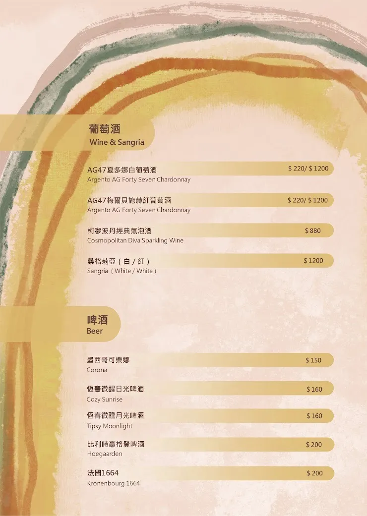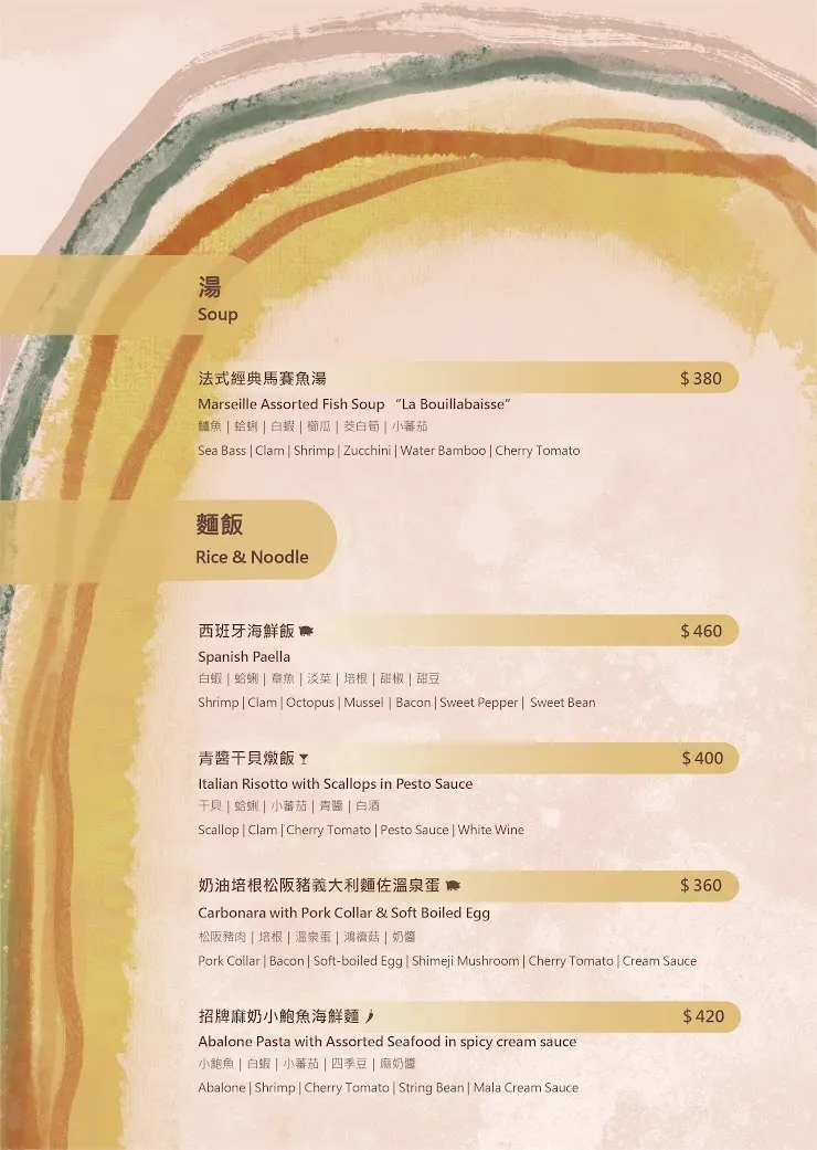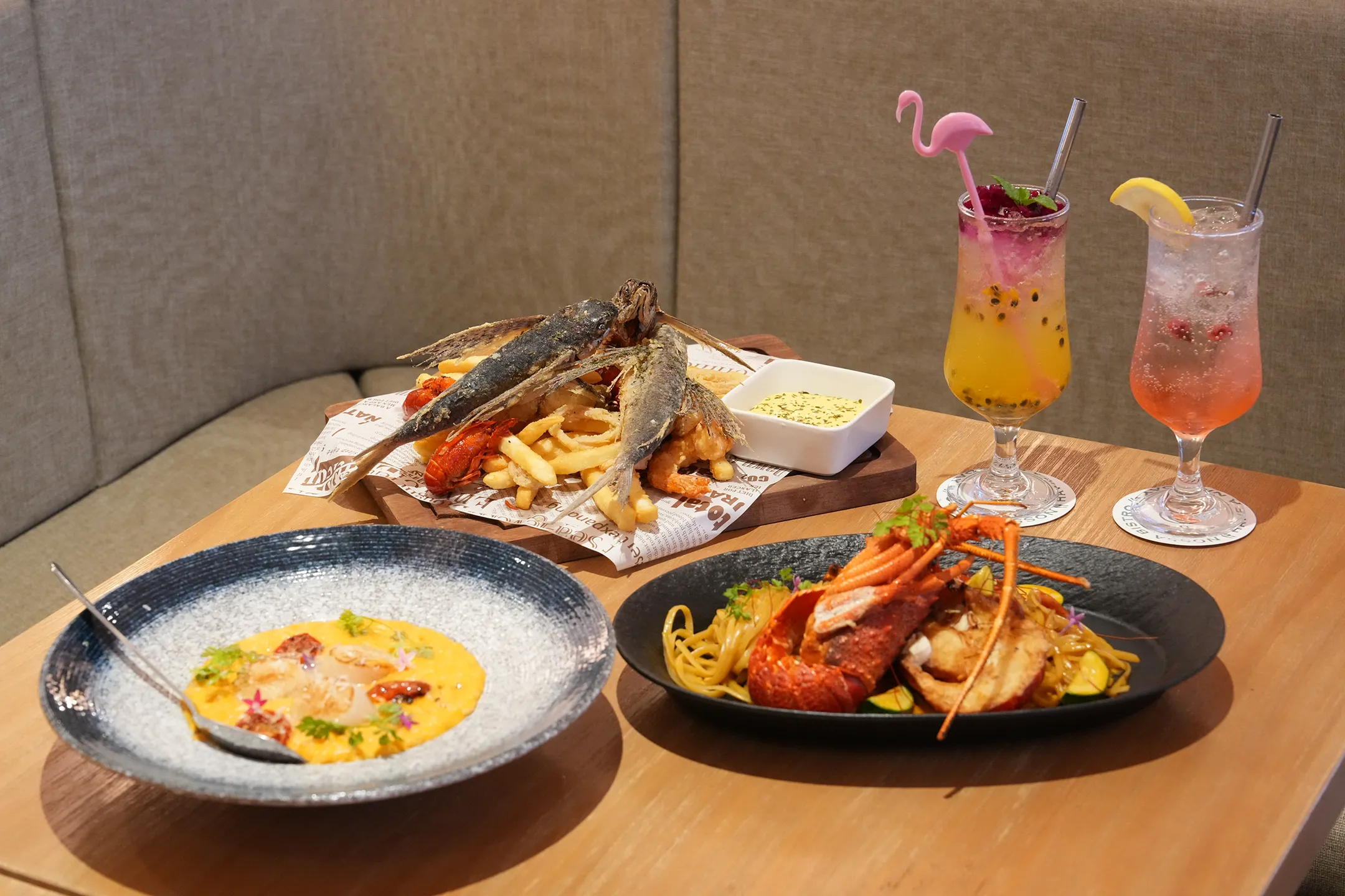 「諾薩餐酒館」位於墾丁大街附近,以摩洛哥風情的紅色建築外觀在藍天白雲下格外吸睛,彷彿讓人秒出國度假。餐廳內部運用粉色系與寶石綠色調展現異國風情,大量鏡面設計讓室內座位也能欣賞海景。最大亮點是360度圓弧沙發座位區,採階梯式設計,每個角度都能輕鬆看見小白灣的湛藍海景,非常適合約會或聚餐拍照。餐廳主打地中海料理,使用在地食材製作義大利麵、燉飯、湯品、沙拉等豐富菜色。人氣餐點包括48小時紅酒慢燉牛頰、炙煎脆皮鴨胸佐無花果醬、炸飛魚小龍蝦海鮮拼盤等。不過實際品嚐後,餐點表現比較沒那麼驚艷,口味上偏重或偏淡的搭配不太平衡,像是龍蝦偏鹹但義大利麵偏淡,海膽燉飯雖然海味濃郁但容易膩口。