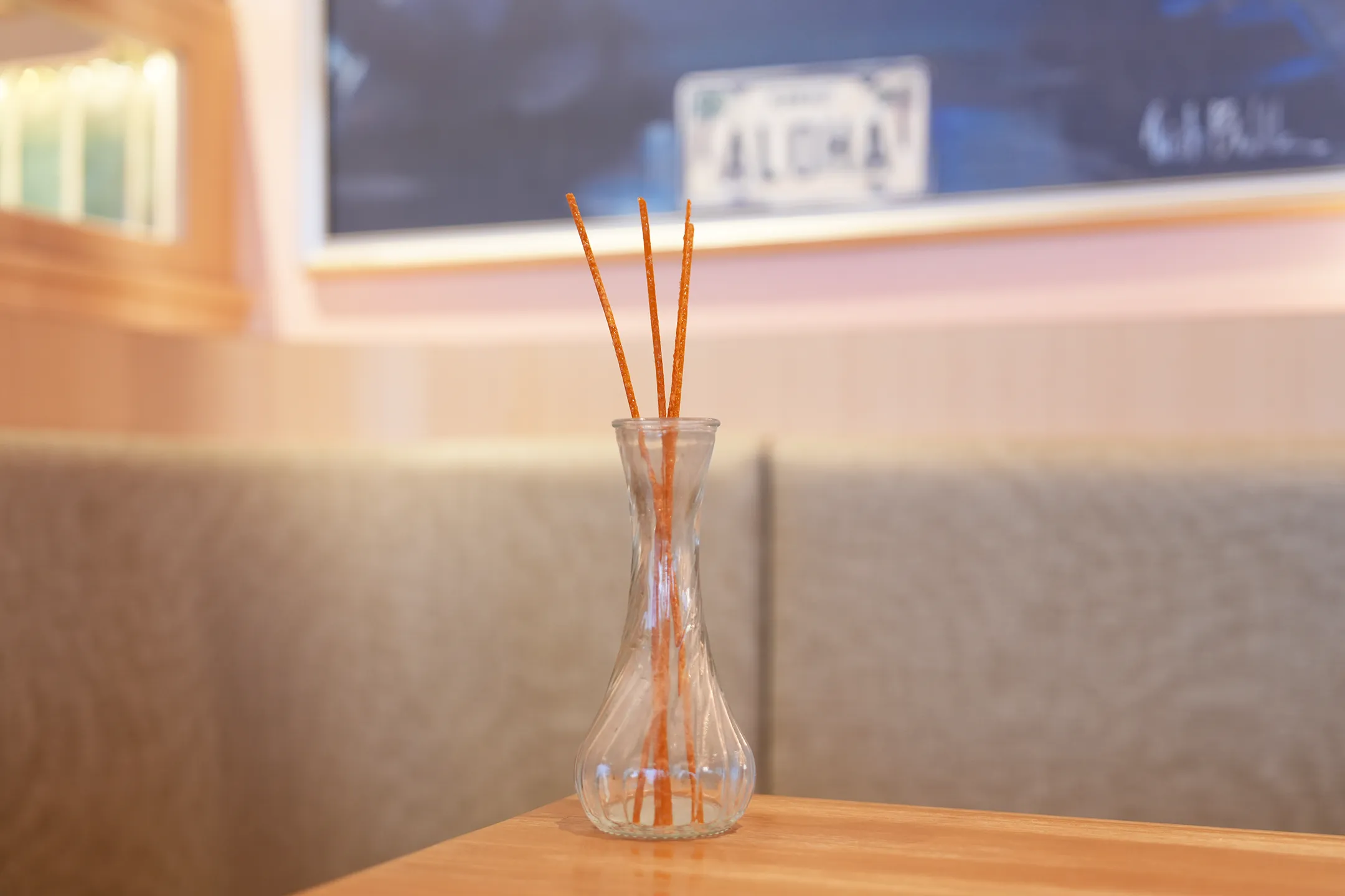 ▼入座後,店員端上一個花瓶造型的容器,裡頭插著的竟是一根根炸義大利麵。炸麵條吃起來酥脆爽口,雖然調味清淡,但主要就是品嚐那特殊的酥脆質地,算是一道有趣的開胃小點。