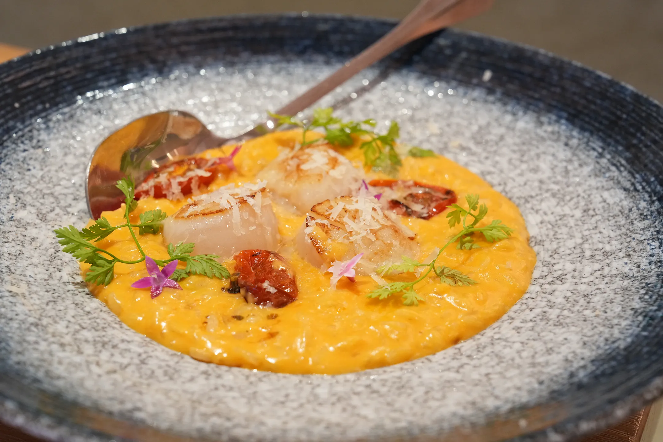 ▼海膽燉飯可以吃到非常濃郁的海膽味,一入口就能感受到滿滿海味,干貝煎得恰到好處、軟嫩鮮甜。不過海膽風味強烈,吃到後面會稍微感到膩口,如果你不是非常愛海膽味的人,可能會比較不能接受這一道料理的海膽味。