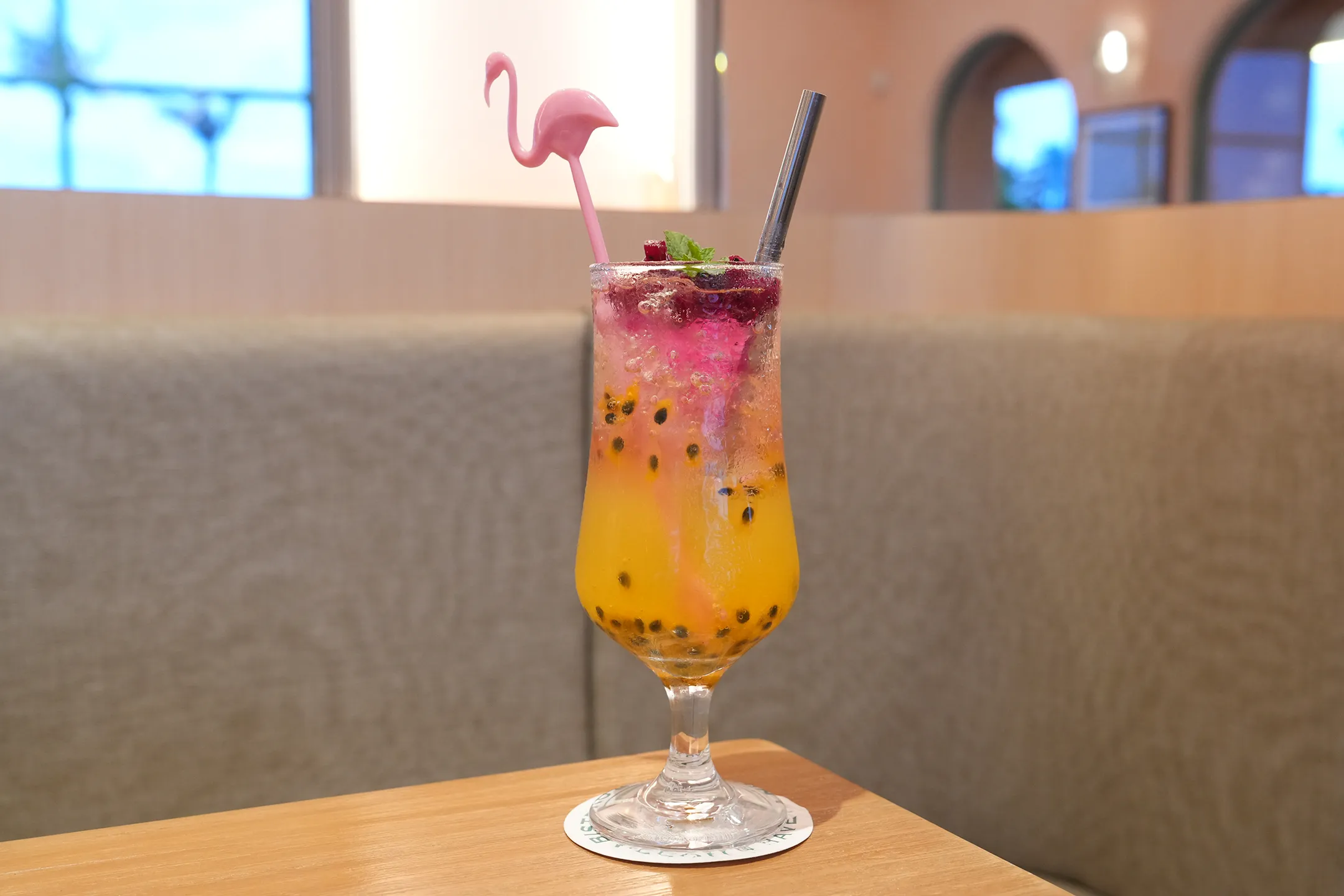 ▼「熱情果漾」的百香果味道很明顯,搭配火龍果粒、養樂多、雪碧和薄荷葉,整體喝起來清爽解膩,甜度適中不膩口。