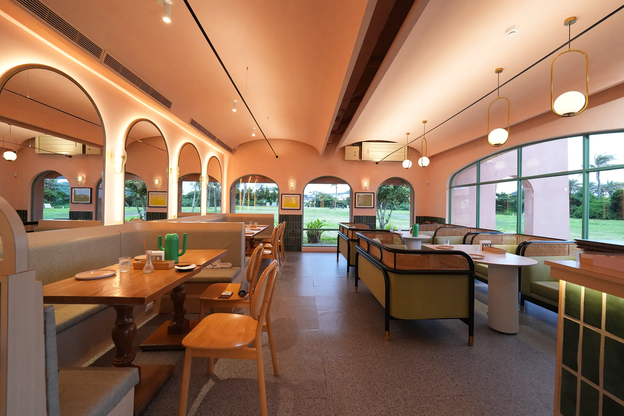 ▼櫃檯區域的粉橘色調與拱形窗設計,營造出一致的摩洛哥風情。透過拱形窗可以看見窗外的綠意盎然,即使在櫃台等候區域也能感受到度假的悠閒氛圍。