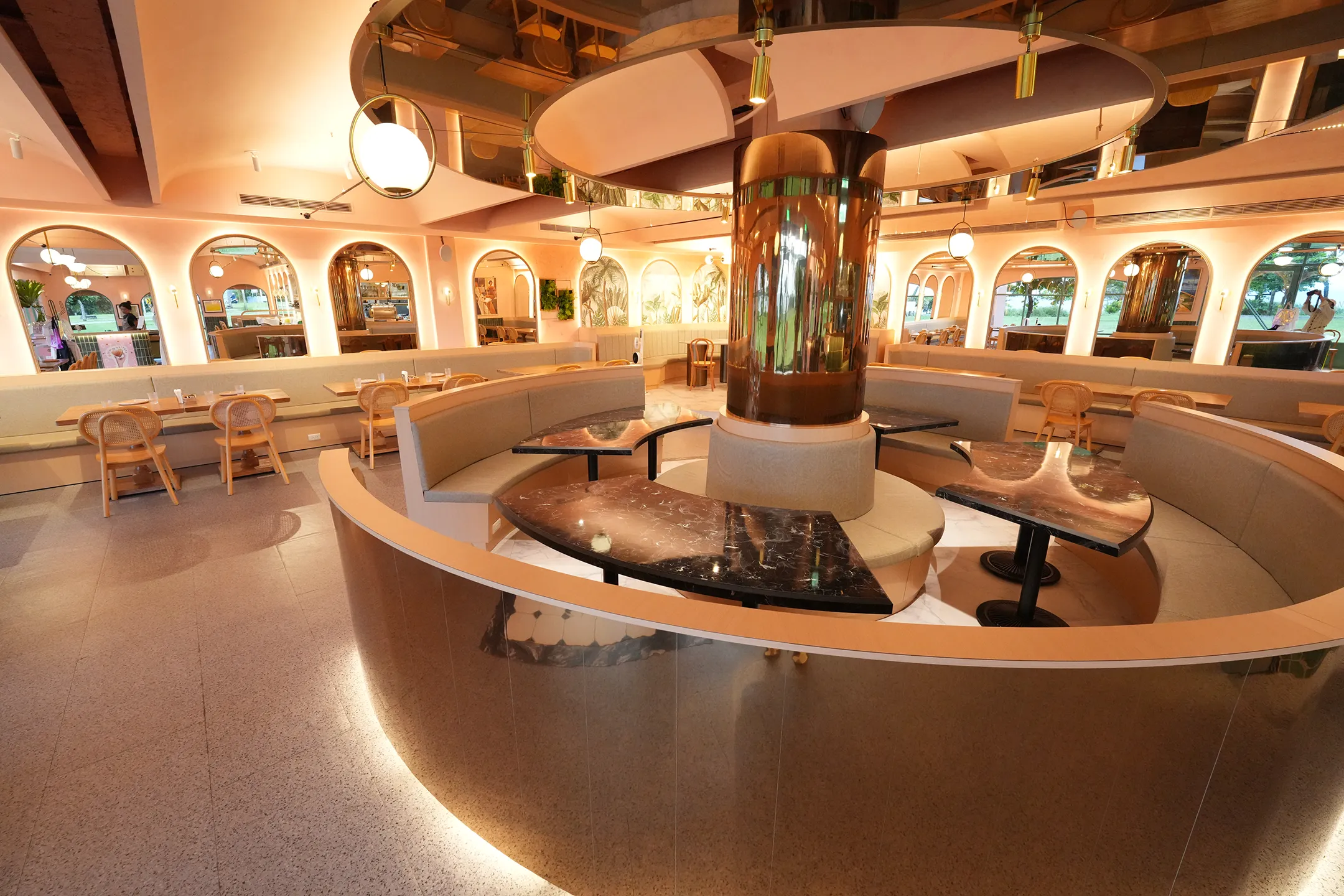 ▼餐廳最吸睛的360度圓弧沙發座位區,中央的金色圓柱與大理石桌面相互輝映,展現奢華質感。整體空間運用大量鏡面設計,不僅放大視覺效果,更將窗外的藍天綠地引入室內,度假氛圍感滿滿。
