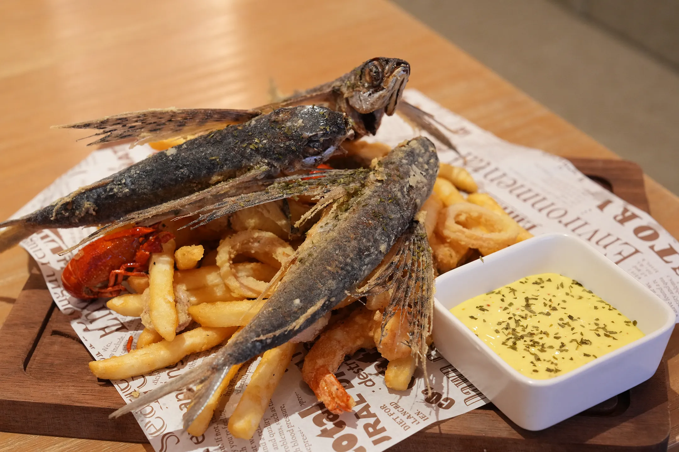 當「酥炸飛魚」端上桌時,我們面對這整尾炸得金黃的飛魚一時不知如何下手,所幸店員主動前來協助分解。這是我第一次品嚐飛魚,魚肉質地比預期來得紮實有嚼勁,不過魚刺確實偏多,需要細心慢食。一旁的薯條表現中規中矩,外層酥脆、內裡鬆軟綿密。小龍蝦的調味恰到好處,鹹香適中,我個人認為單吃就很夠味,無需額外沾醬。相較之下,炸蝦的表現較為平淡,沒有特別突出之處。至於炸魷魚圈,尺寸偏小巧,雖然炸得酥脆,但或許因為太小,咀嚼時少了點口感。