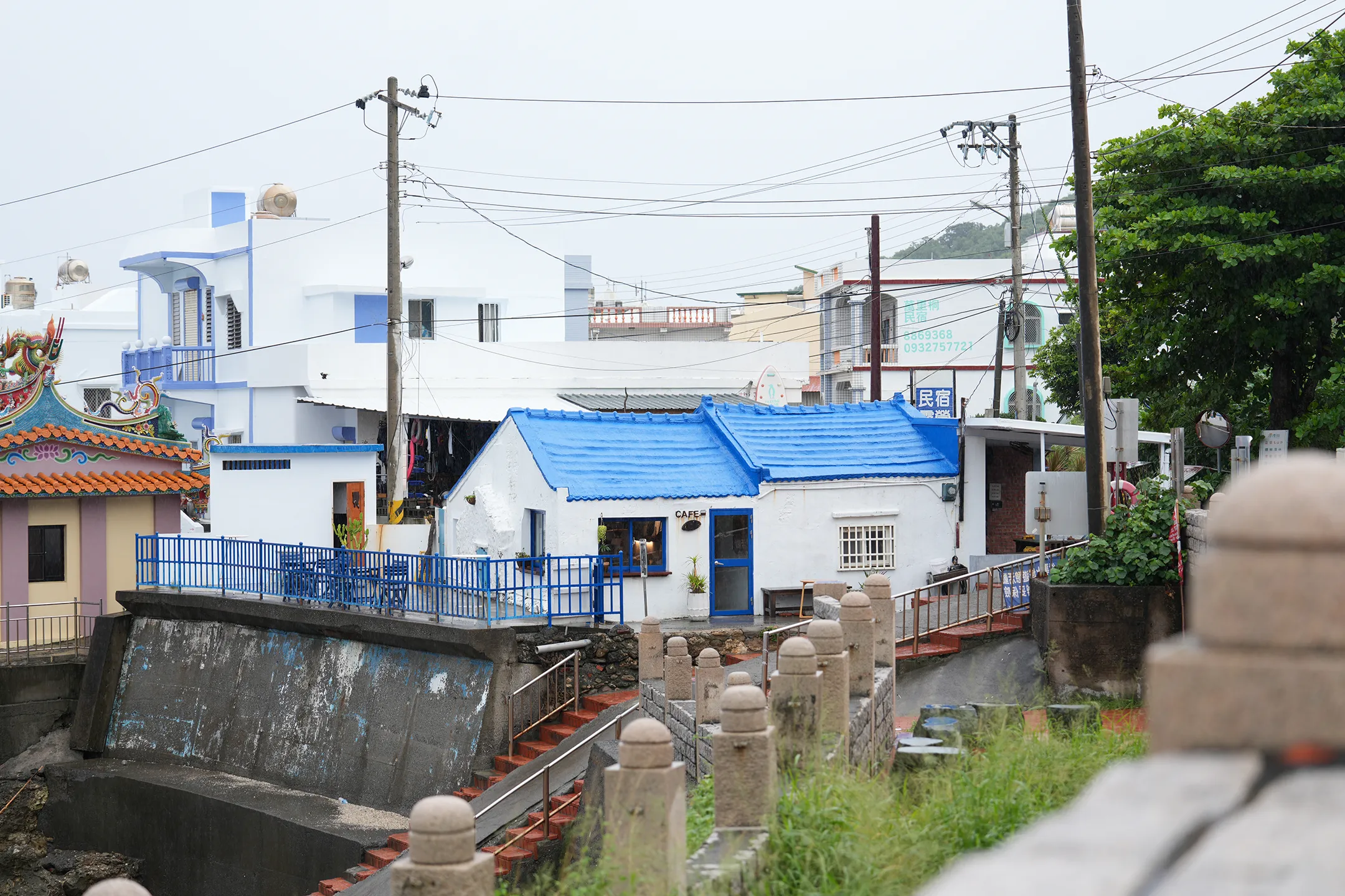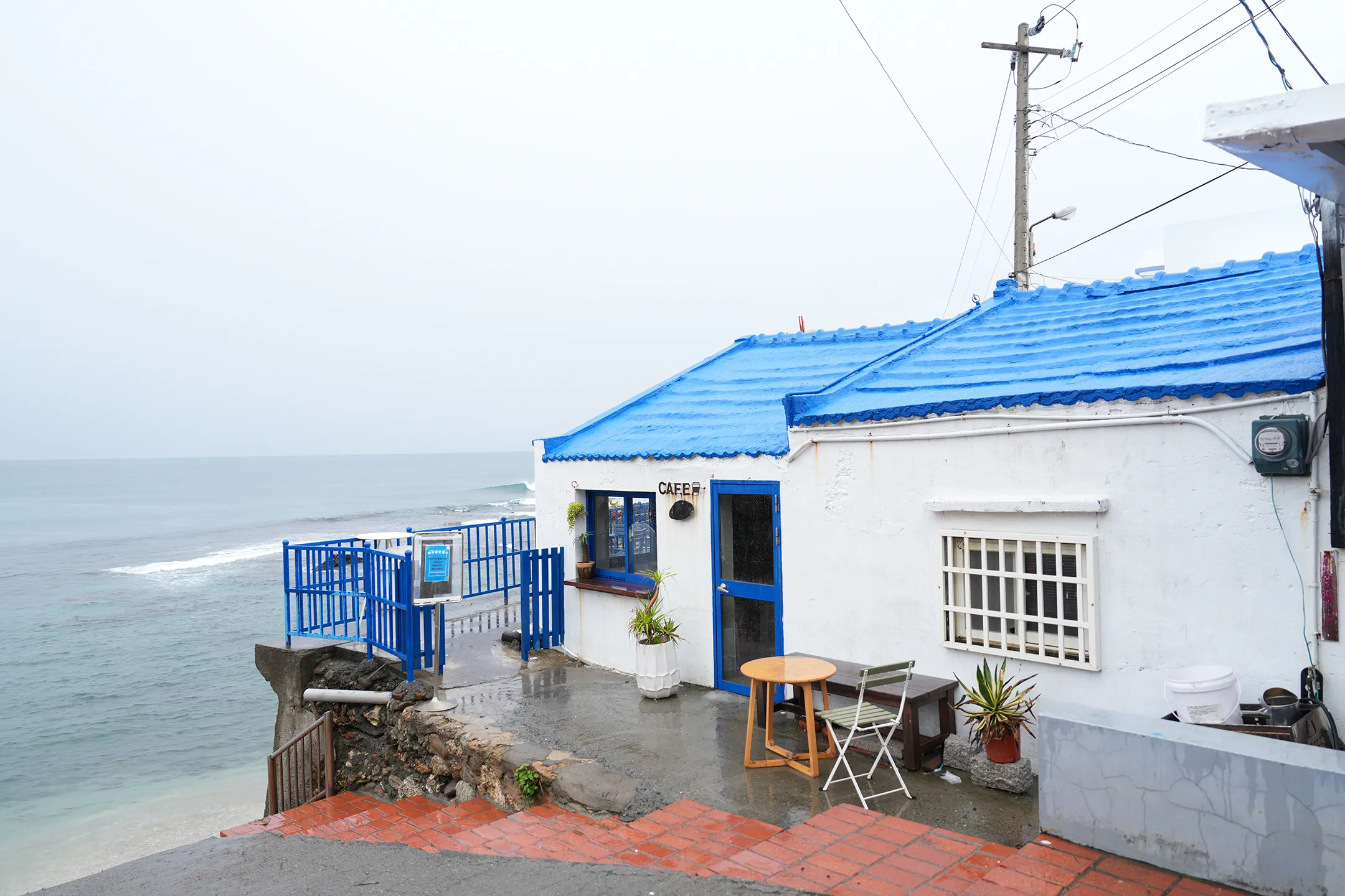 ▼「Oct.Sun Coffee」就是這棟海岸邊的小屋,標誌性的藍白配色讓整體氛圍瀰漫著濃濃的地中海感。鮮明的藍色屋頂在灰濛濛的天氣裡格外亮眼,一眼望去真的會讓人誤以為來到希臘某個低調的小角落,充滿度假感。