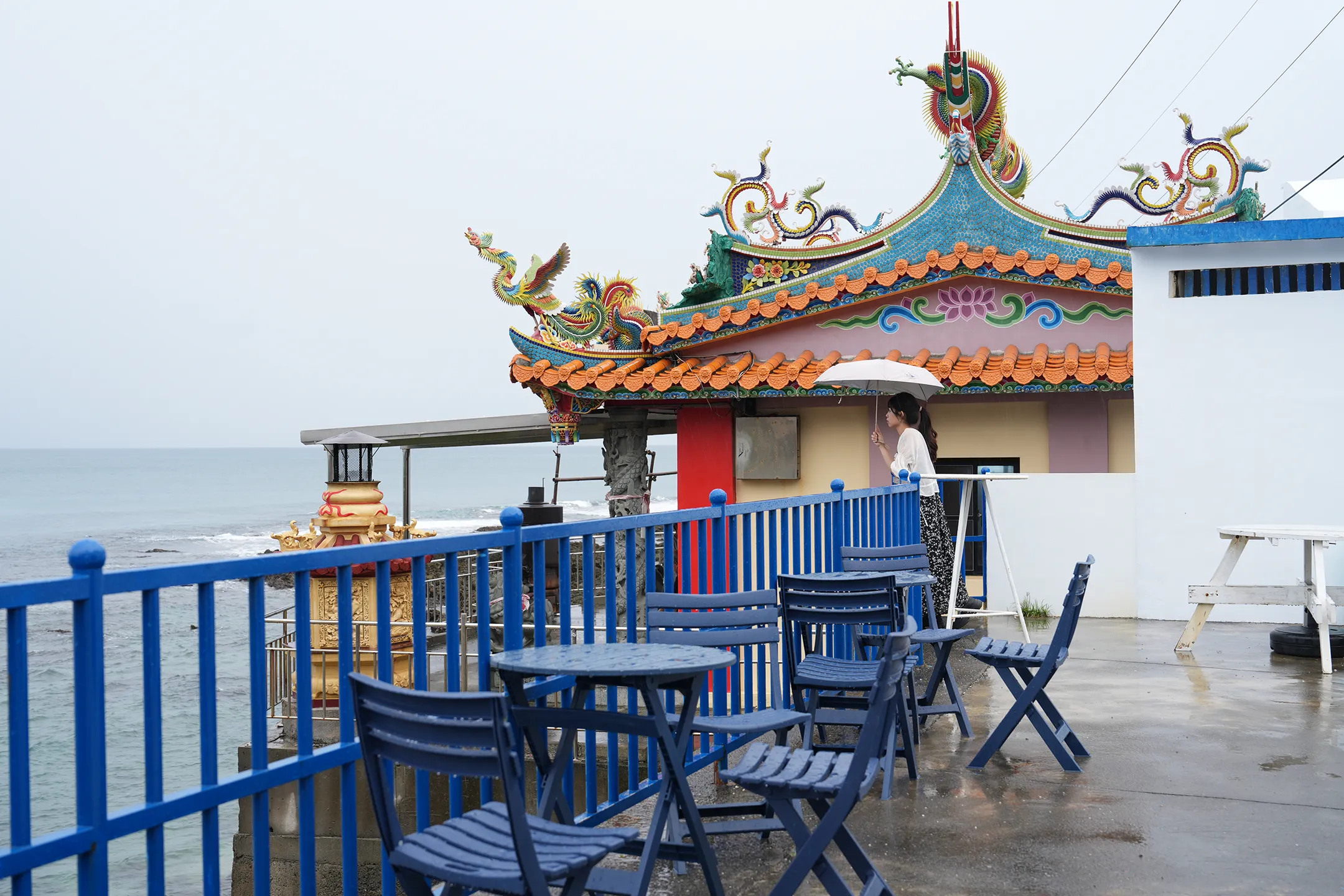 ▼戶外座位區也是用藍白配色的桌椅,比較特別的是座位區後面居然有一座「萬里桐萬應公祠」小廟!這個組合真的很有趣,咖啡館旁邊直接連著廟宇,雖然乍看有點衝突感,但反而讓這裡變得很有特色,也多了一份在地的文化味道。