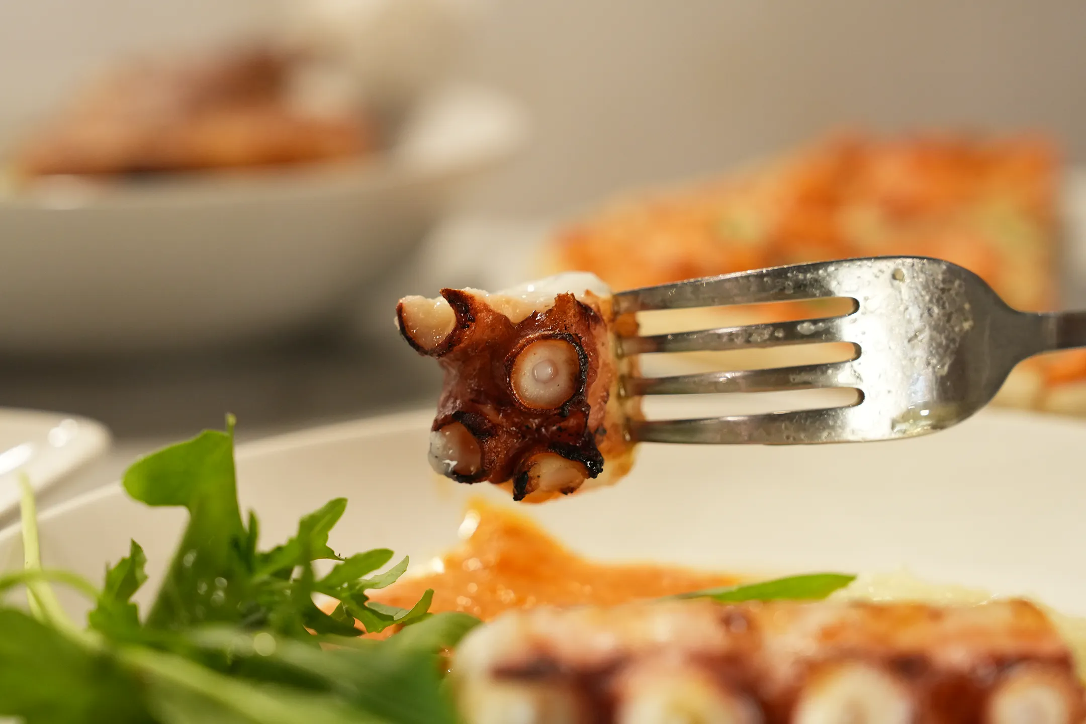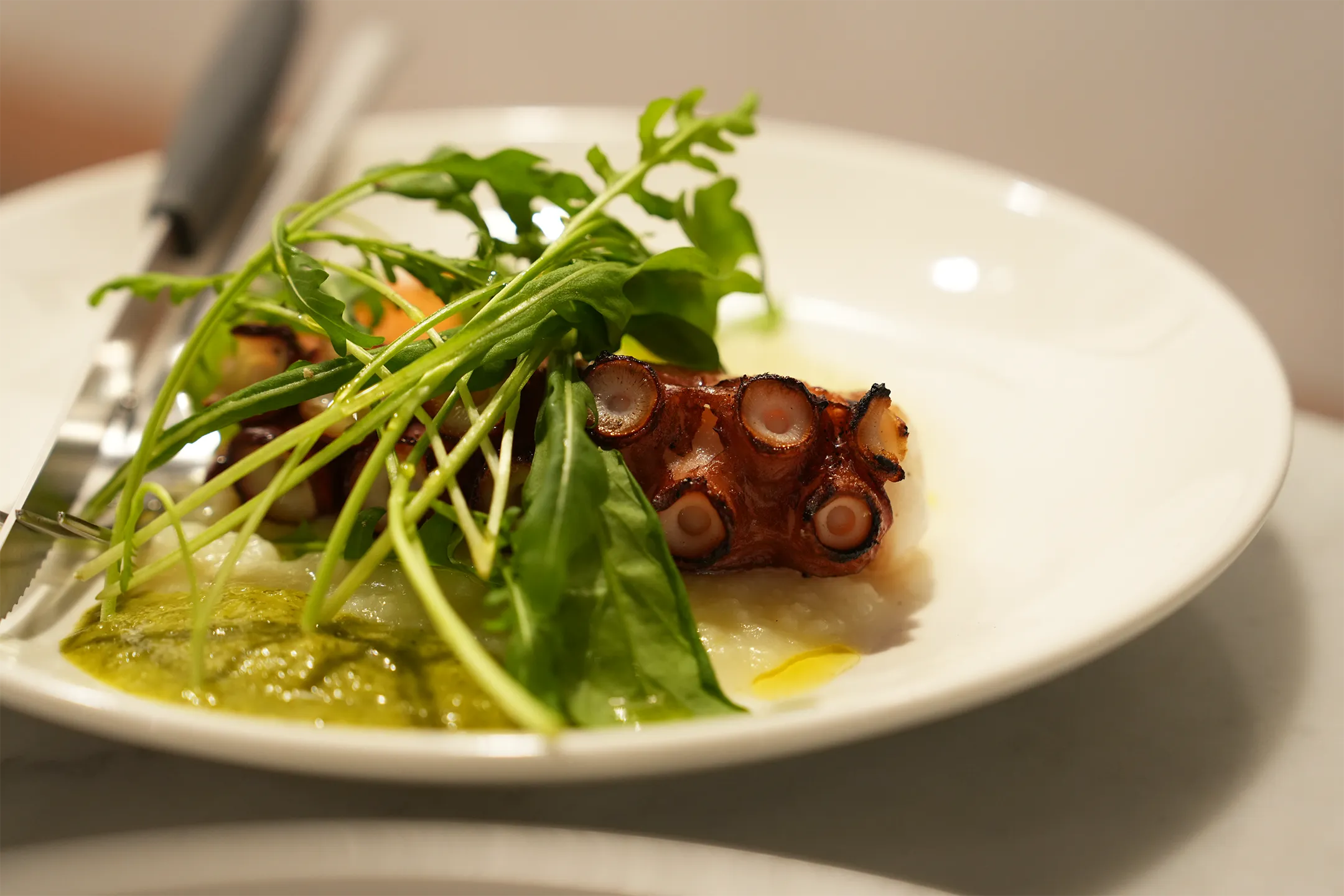 烤製過程讓章魚表面帶有迷人的焦香,內部則保持軟嫩多汁。搭配的紅椒堅果醬帶來微微辛辣與堅果的香氣,為海鮮增添層次,鹹香微辣的風味完美襯托出章魚的鮮甜,建議品嚐時可以切成小塊,更容易咀嚼也能讓醬汁與章魚充分融合。