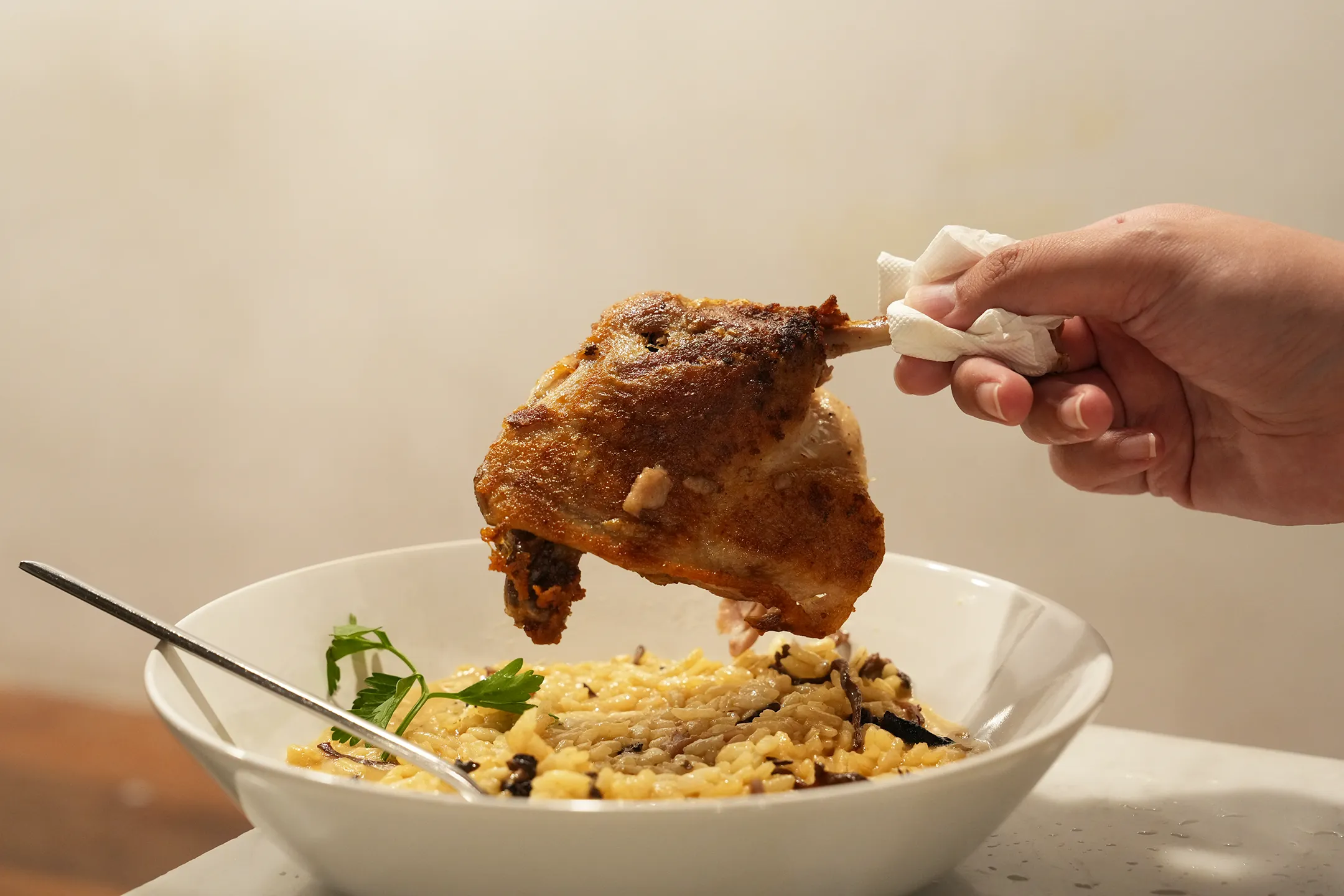 ▼「油封鴨腿野菇松露油燉飯」是「迷路小章魚餐酒館」的招牌菜色,油封鴨腿經過低溫慢煮,肉質軟嫩多汁,輕輕一撥就能骨肉分離。鴨皮烤得金黃酥脆,與軟嫩的鴨腿肉一起入口,酥脆與柔嫩的對比口感令人驚艷。