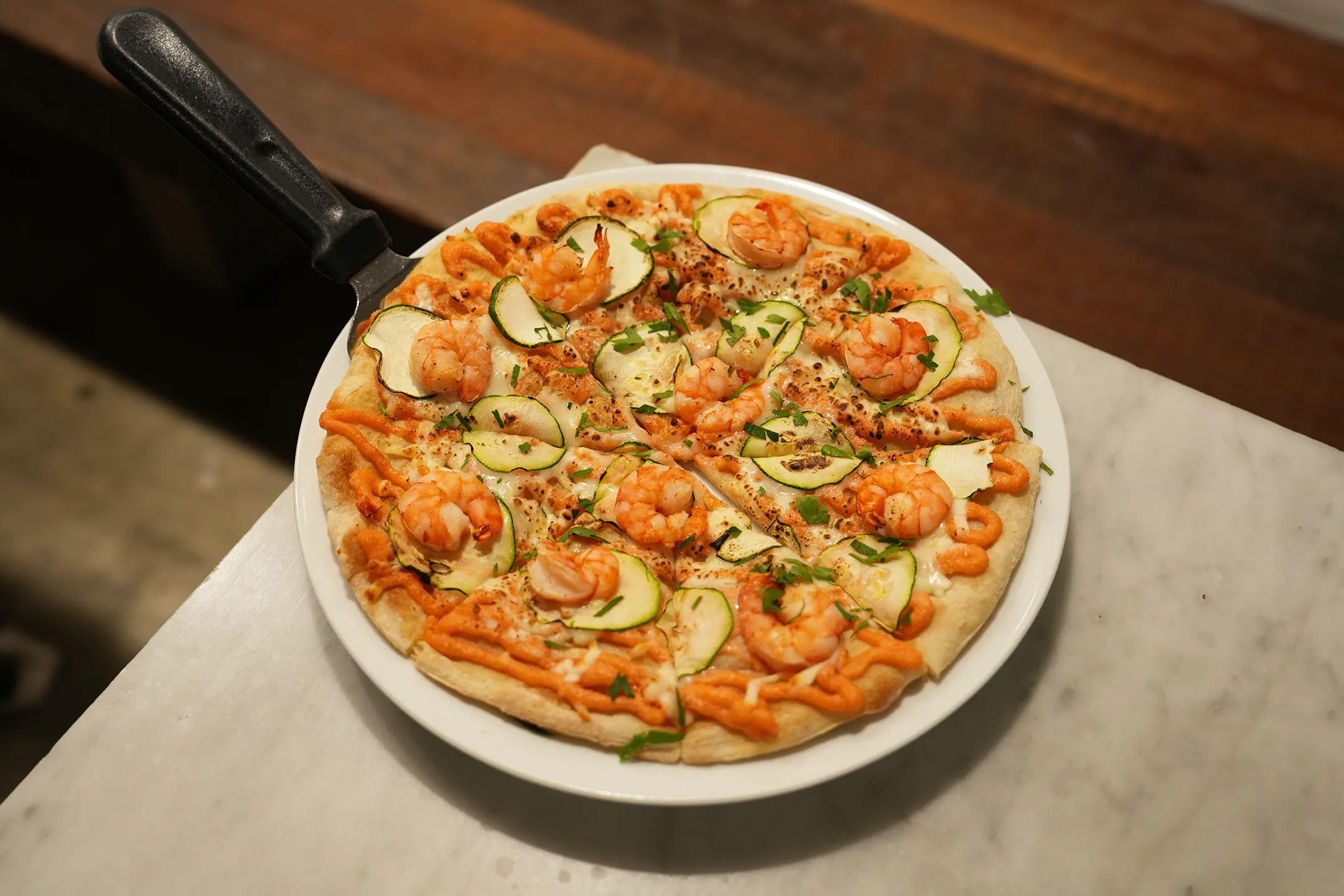 ▼「鮮蝦櫛瓜明太子烤餅」呈現豐富的海洋鮮味,飽滿的蝦仁肉質Q彈緊實,搭配爽脆的櫛瓜,明太子醬帶來微微的辛辣與鹹香,完美提升整體風味層次。一口咬下,酥脆的餅皮與豐盛的配料在口中交織,鮮、香、辣三者巧妙融合,味道飽滿而不膩口。