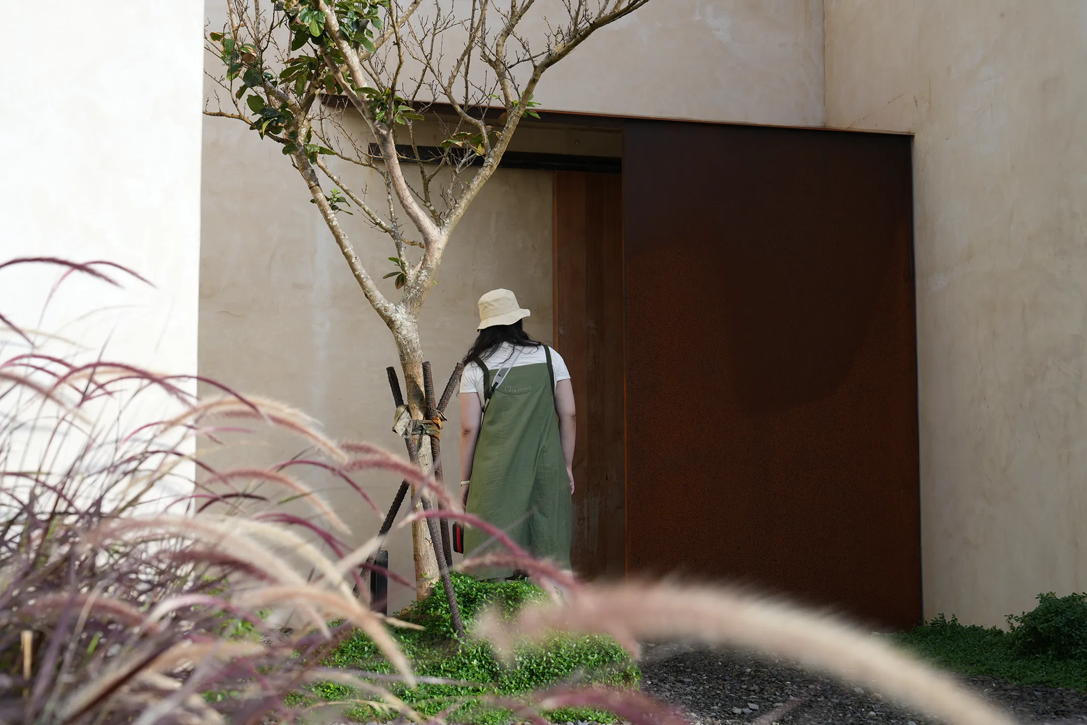 ▼乍看之下,整面木質外牆看起來渾然一體,完全找不到入口在哪裡,讓人不禁有些困惑。走近仔細觀察後才恍然大悟,原來入口採用了水平滑動的推拉門設計,巧妙地隱藏在木板後方。這種將門片完美融入建築立面的手法,展現出設計師對細節的講究。