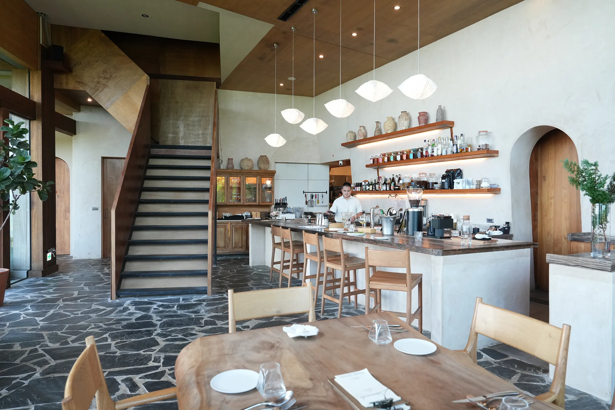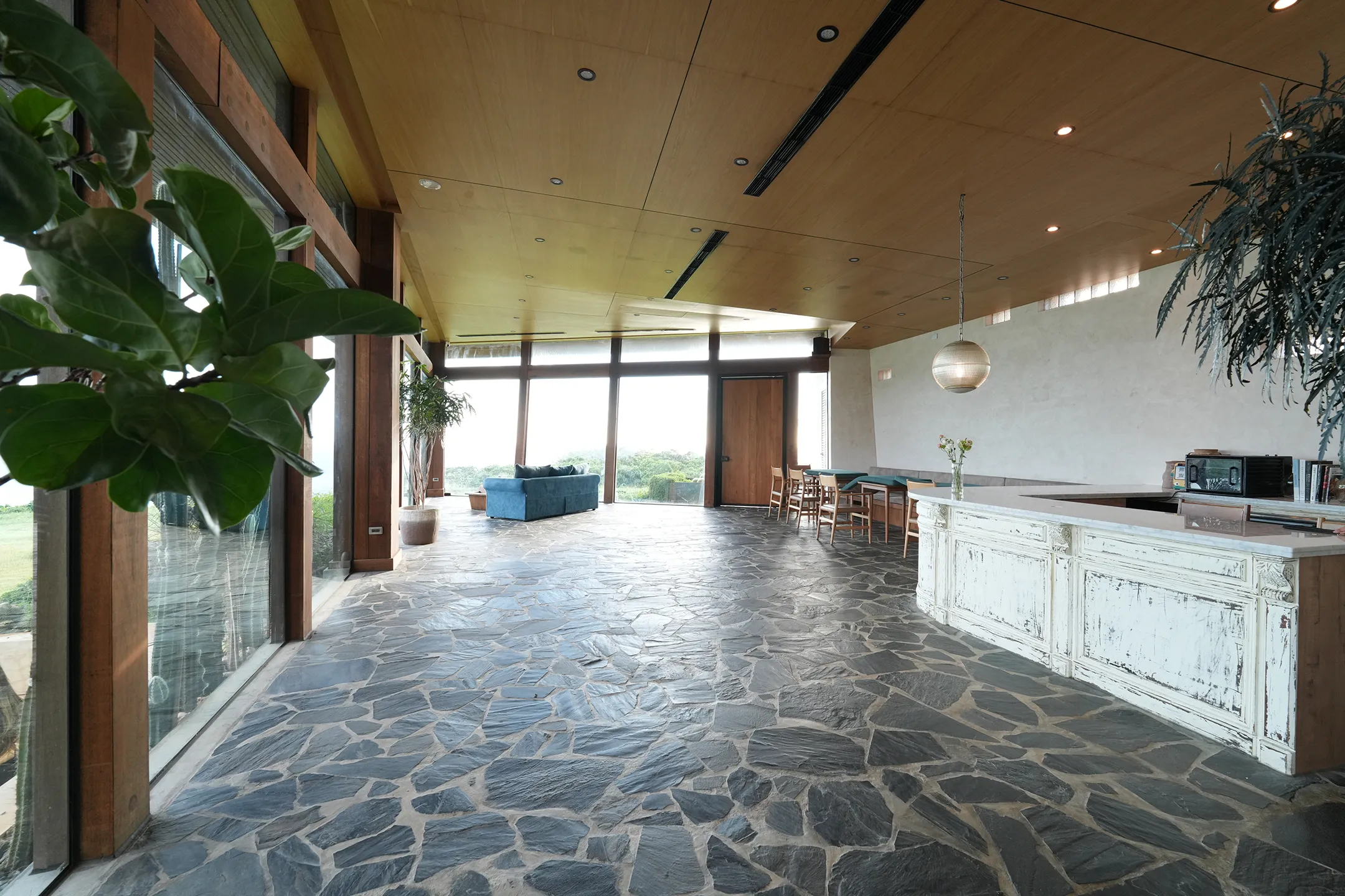 照片中的階梯則是通往二樓民宿的入口。海丘結合了餐廳與住宿空間,讓遊客不只能來這裡享用美食,更可以選擇在此住上一晚,徹底沉浸在這片山海美景之中。