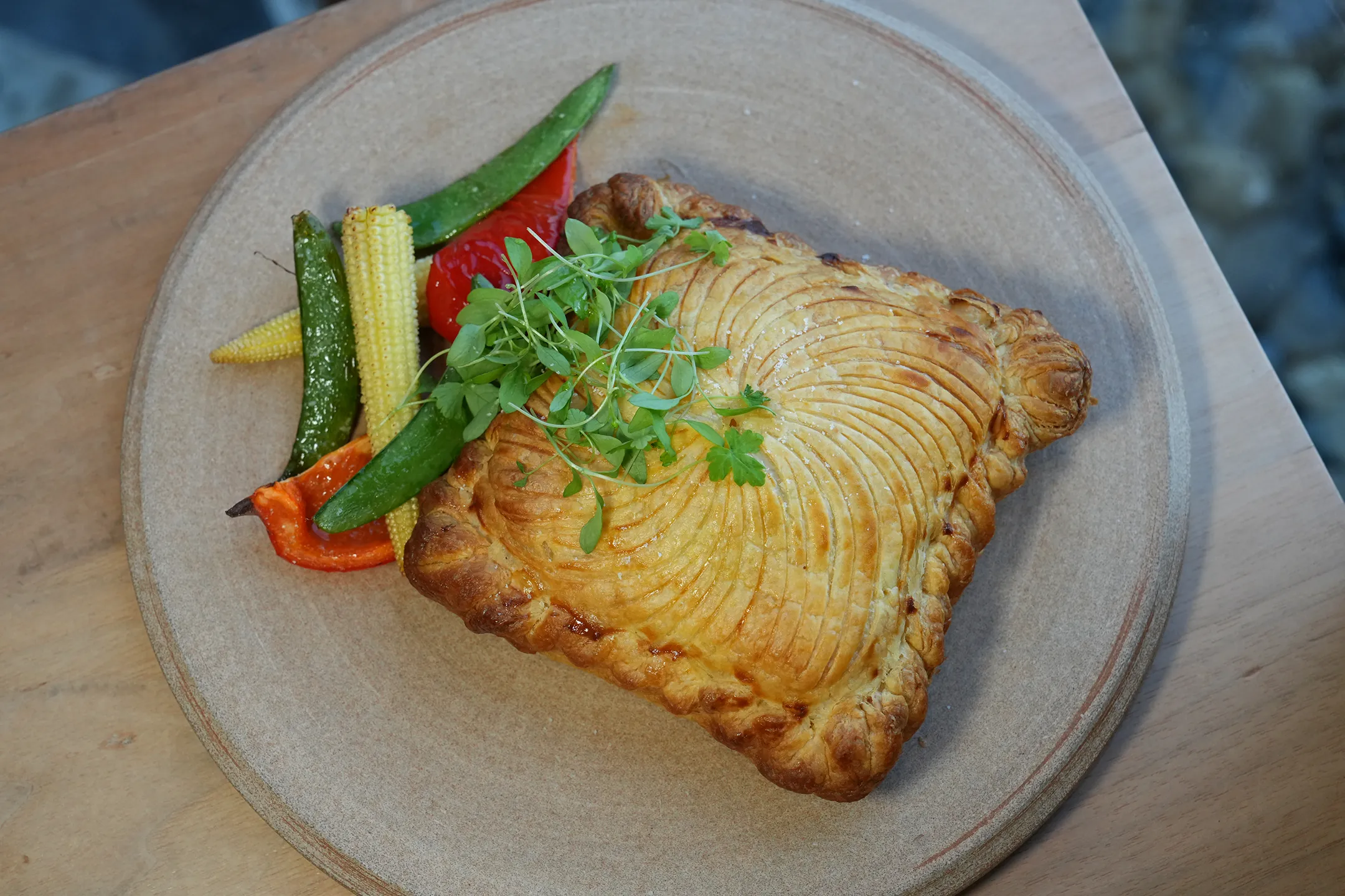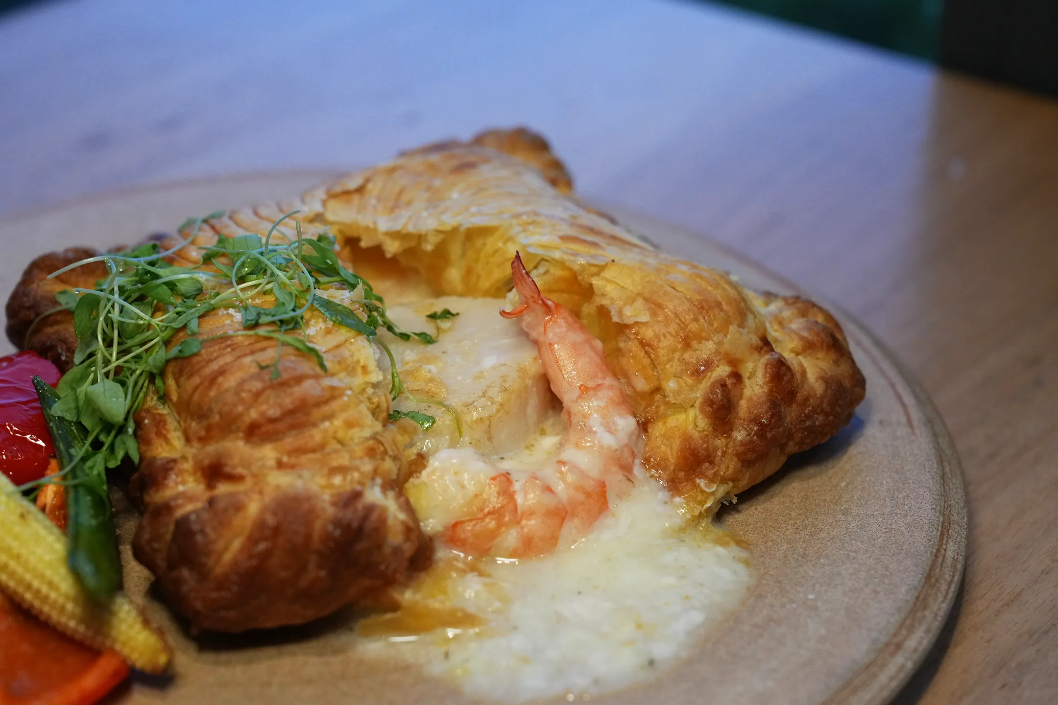 ▼綜合海鮮派的外觀看起來相當誘人,讓人非常期待切開後會有什麼驚喜。酥脆的外皮一劃開來,就有濃郁的白醬流出來,接著映入眼簾的是超大隻的蝦子、干貝等豐富海鮮。海鮮吃起來很新鮮,不管是酥皮、海鮮、新鮮時蔬,搭配白醬都非常好吃,整體而言風味跟口感層次相當豐富,是我個人相當喜歡的一道料理。