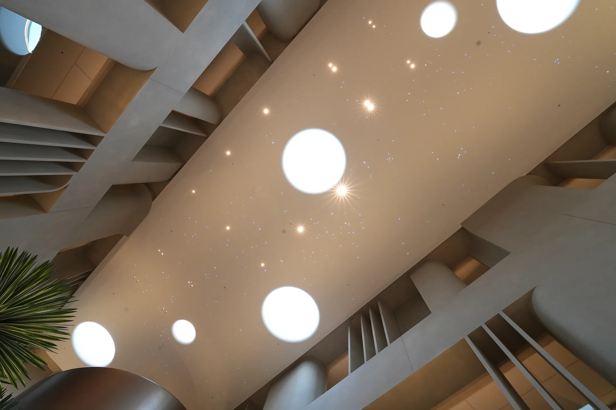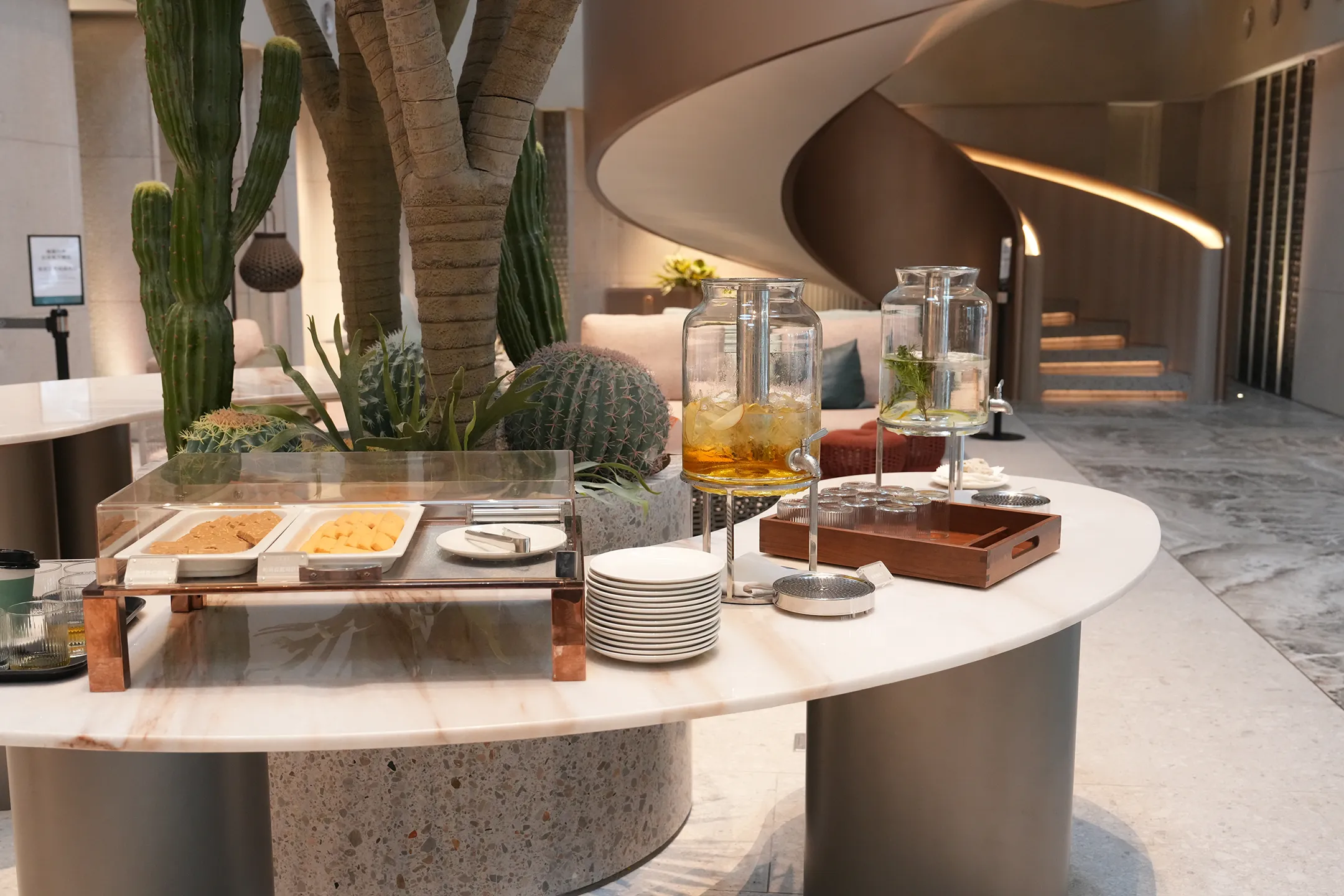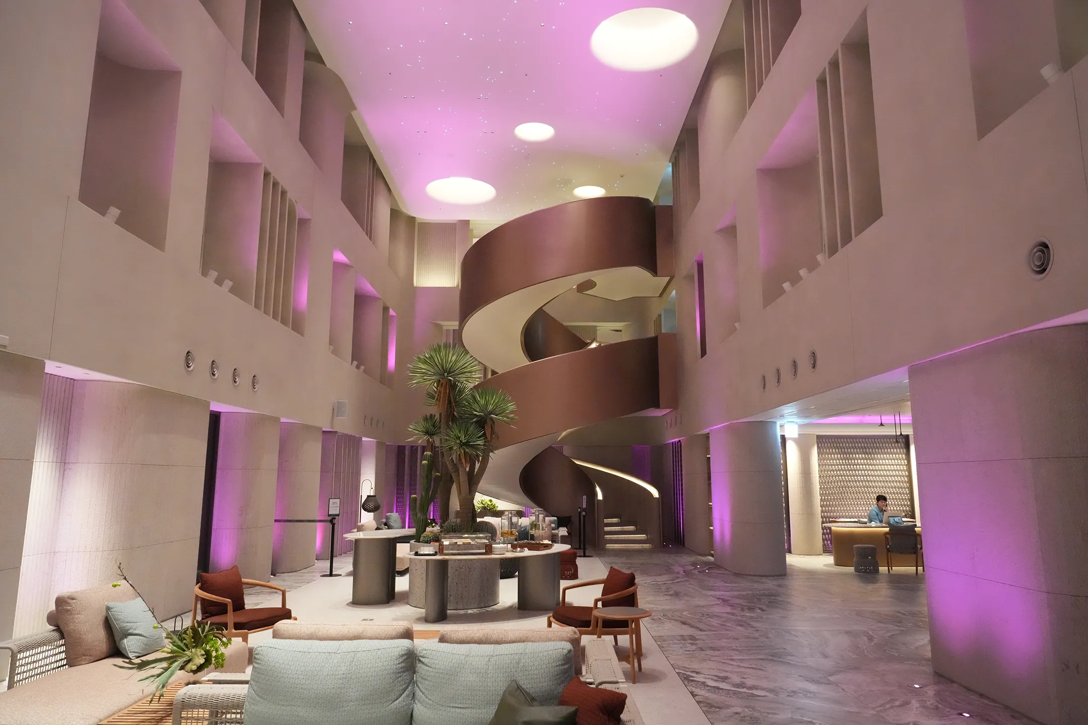 ▼大廳的整體風格現代且充滿設計感。寬敞挑高的空間以柔和米灰色為主調,搭配天花板上浪漫的粉紫燈光與星光點點,營造出夢幻又放鬆的氛圍。螺旋階梯相當搶眼,造型十分的優雅,展現建築美學。周圍擺放著舒適的沙發與木質座椅,中間還有植物與仙人掌點綴,增添了自然氣息。整體給人高雅寧靜又兼具時尚感的印象,非常適合來放鬆度假。