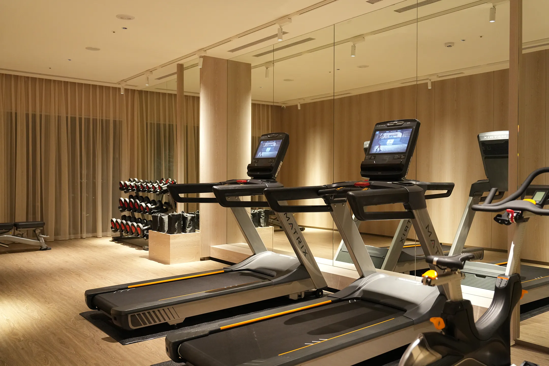 ▼健身房雖然面積有限,但配備齊全,包括兩台跑步機、啞鈴、飛輪和瑜珈墊等設施,可滿足日常運動需求。