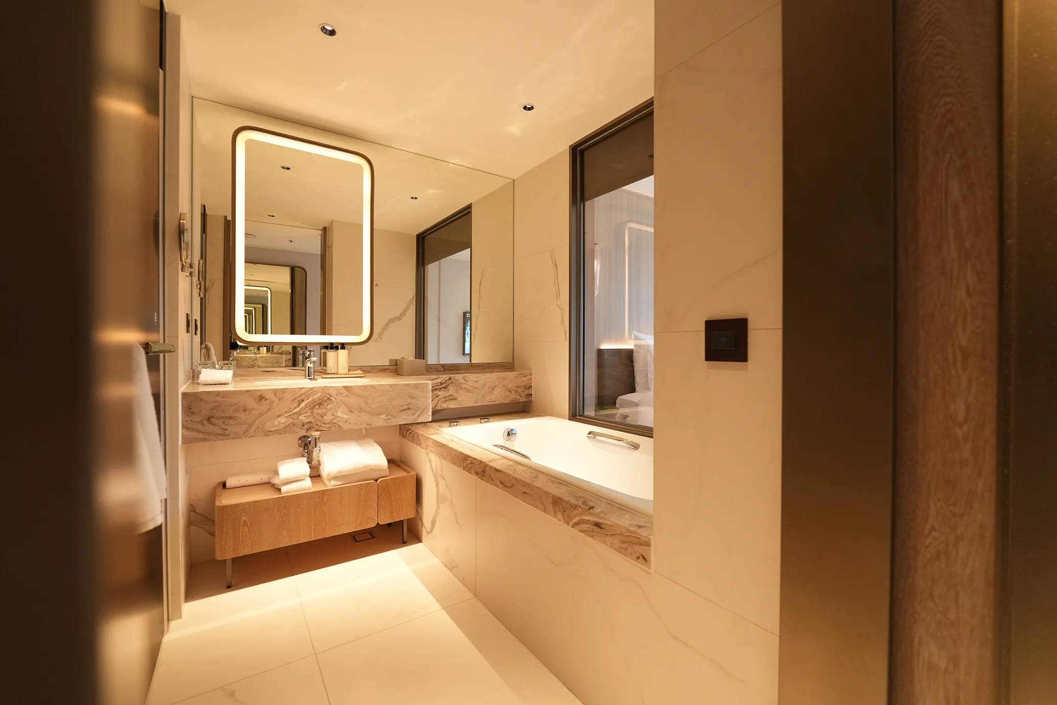 ▼小編身高160公分,浴室的浴缸對坐下來的我來說綽綽有餘,若是沒有拉上窗簾,玻璃可以直接看到房間內部。另外,流理臺的鏡子居然是LED化妝鏡,化妝的時候光線充足真的非常好用。