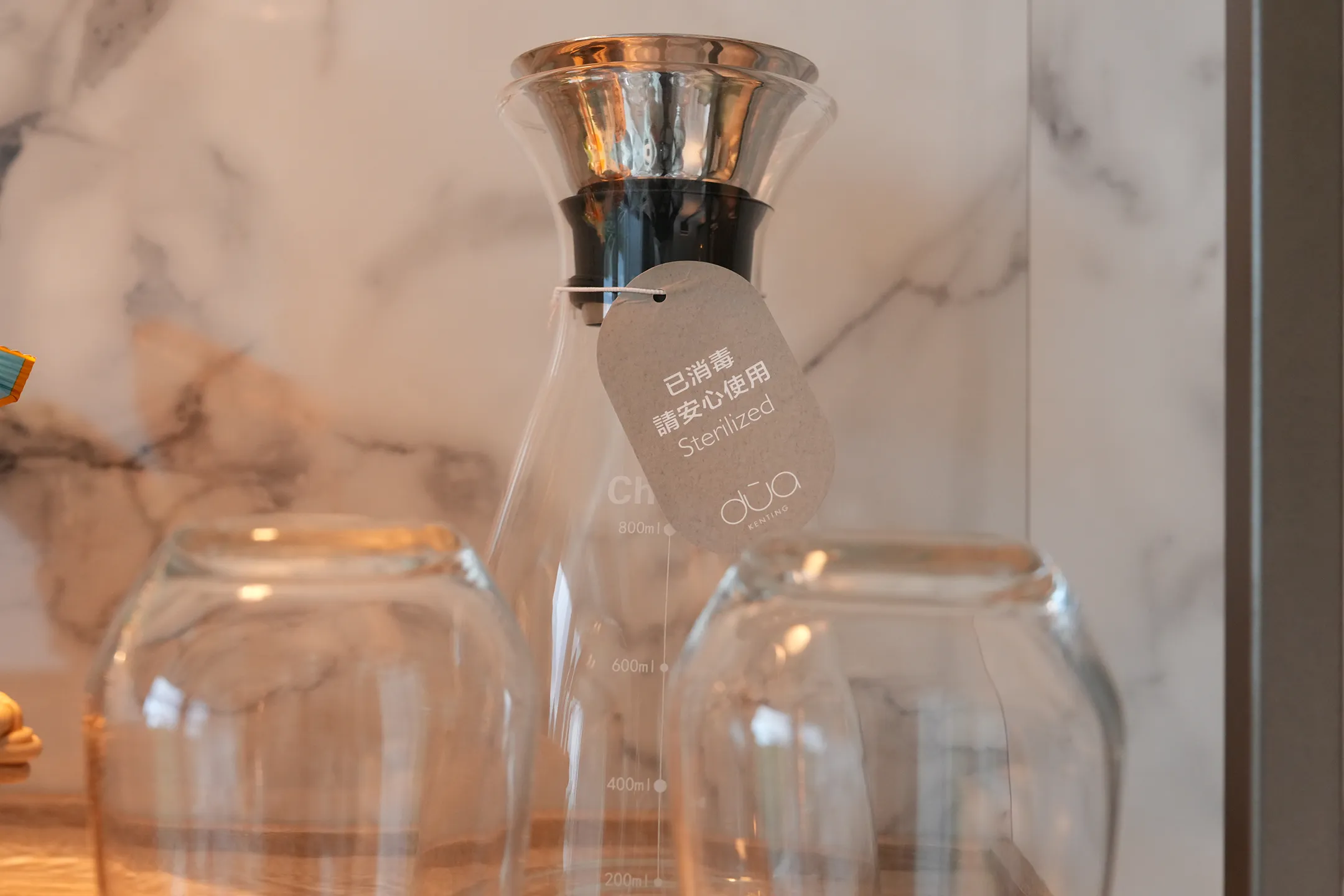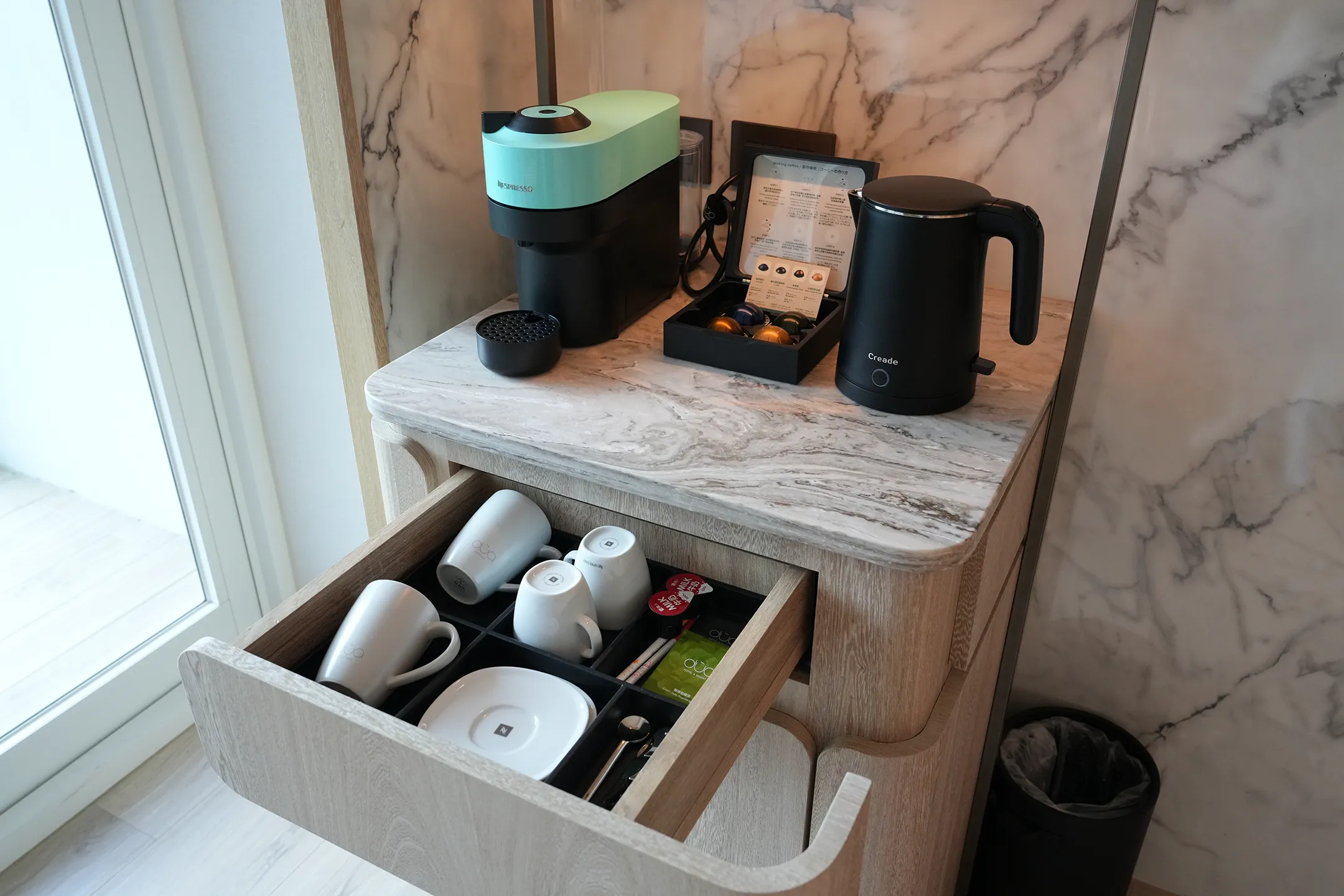 ▼mini bar 的膠囊咖啡機有提供兩款膠囊,也有膠囊咖啡機的使用說明;為了響應環保,「Hotel dùa」每層樓都有飲水機,可以使用玻璃冷水壺裝水,基於安全考量,飲水機沒有提供熱水,需要使用熱水壺煮熱水;打開抽屜,有馬克杯以及茶包、攪拌棒、糖漿等。