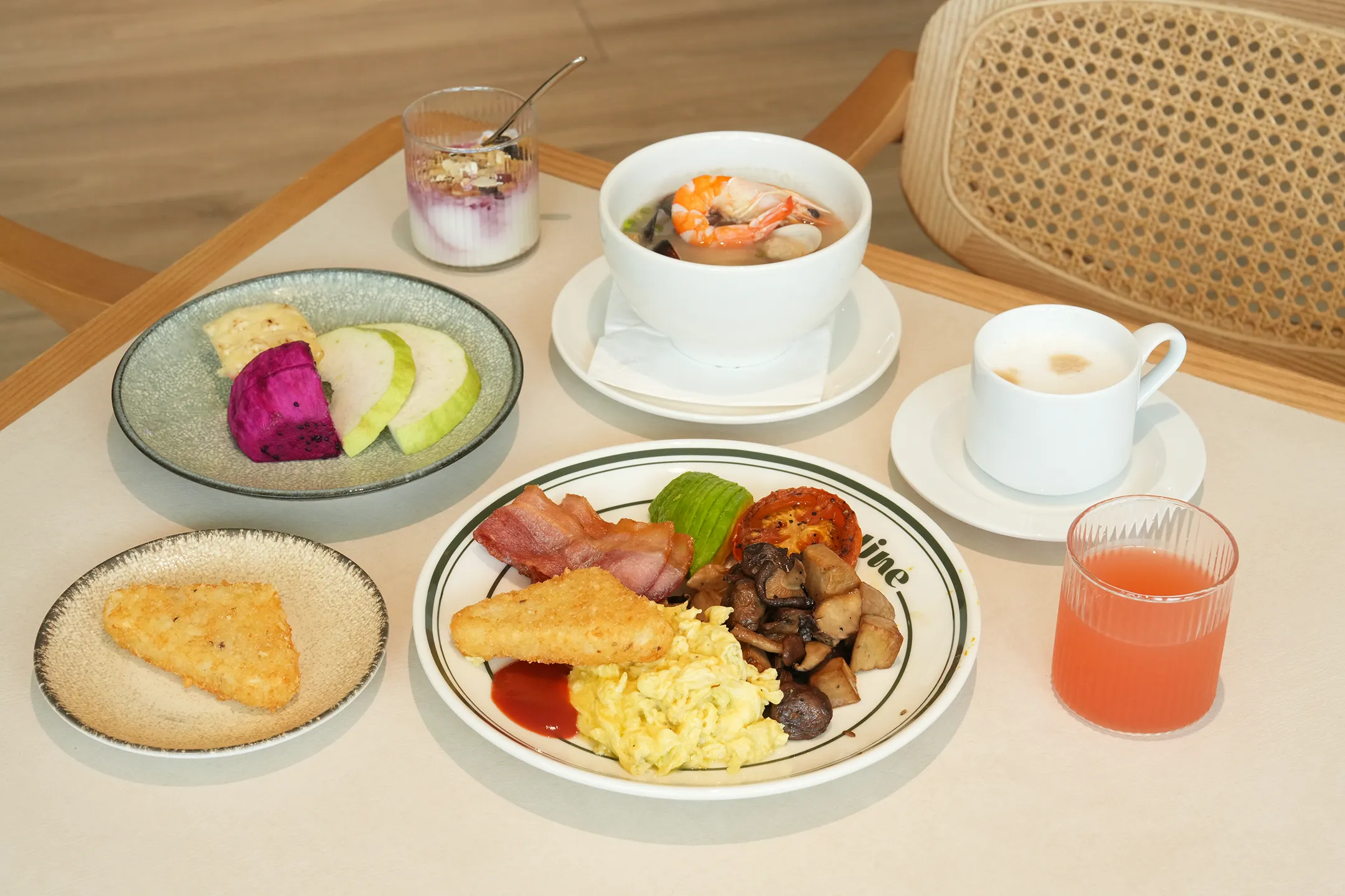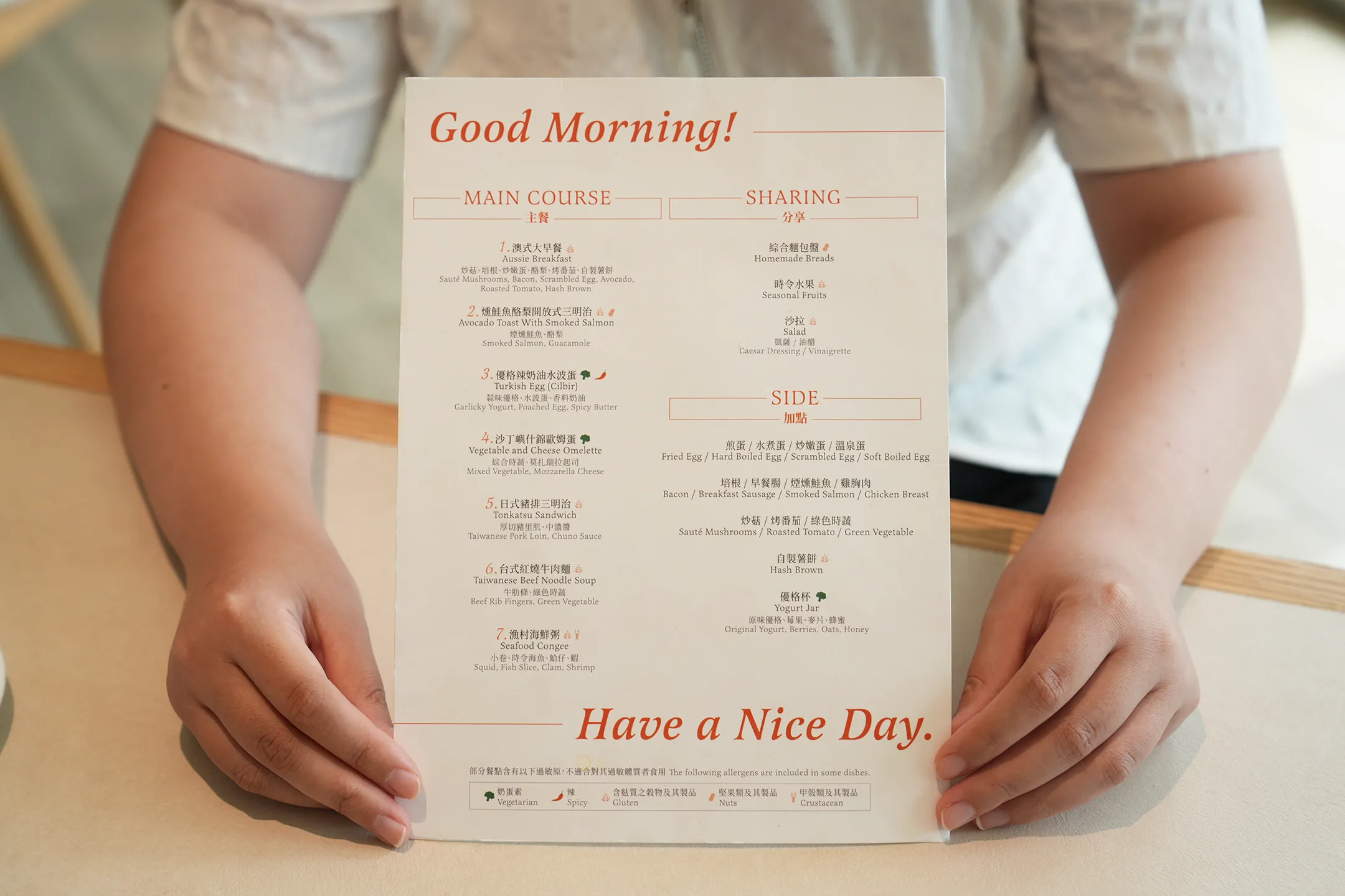 ▼「Hotel dùa」的早餐有別於傳統自助式吧檯,採用點餐制,向服務人員點餐後,現點現做。在早餐時段內都可以無限量點餐,建議可以先品嚐一輪後再行加點,早餐的選擇也很豐富,有中式的海鮮粥、西式的澳洲大早餐、日式的豬排三明治等,可以滿足每個人對早餐的需求。