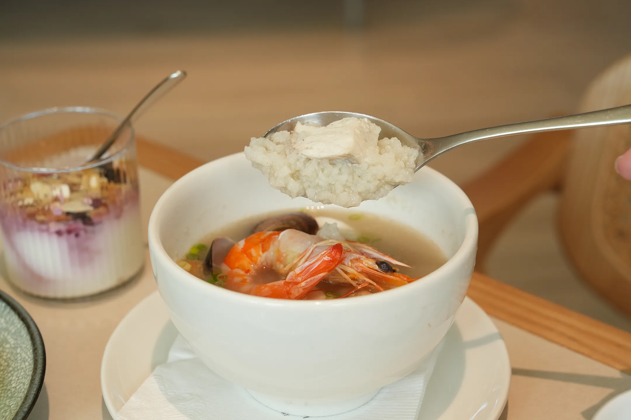 ▼朋友點的「海鮮粥」有:小卷、魚、蛤仔、蝦子,湯頭鮮味十足,海鮮給的很多,整體調味上不會過鹹,很適合早上來一碗暖暖胃。