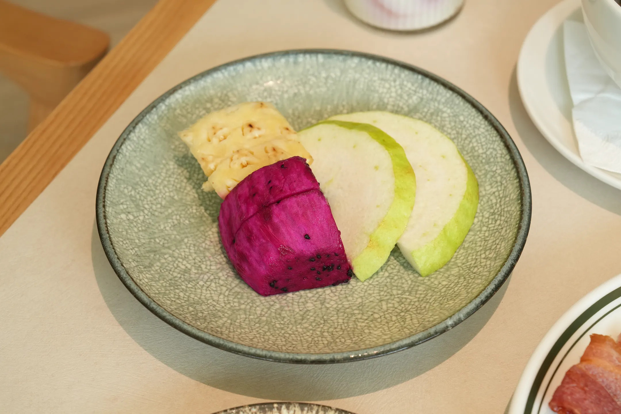 ▼兩人份的水果拼盤包含鳳梨、紅色火龍果及芭樂,每一種水果都精心挑選,飽滿多汁,吃起來清甜爽口,充分展現新鮮水果的天然風味。