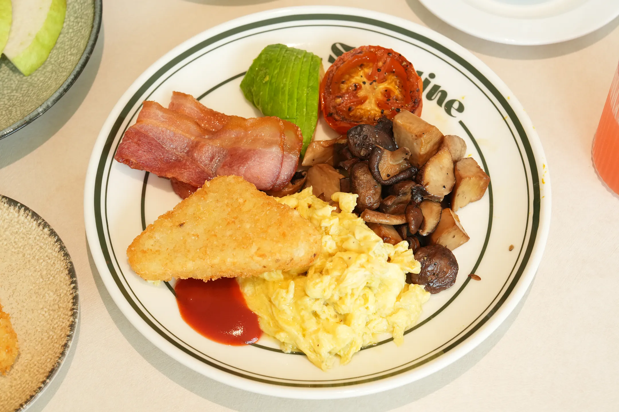 ▼偏好西式早餐的我選擇了「澳式大早餐」,餐點有:炒菇、培根、炒嫩蛋、酪梨、烤番茄、自製薯餅,炒菇吃起來調味不會過鹹,還可以一次吃到好幾種菇;培根吃起來就偏普通,是可以想像的味道;炒嫩蛋吃起來滑嫩美味;酪梨吃起來也很新鮮,但我實在不太敢吃,剩下的就請朋友幫忙吃完;烤番茄撒上香料,調味很剛好、不會太酸;自製薯餅炸的非常剛好,外酥內軟,還能吃到馬鈴薯本身的味道。