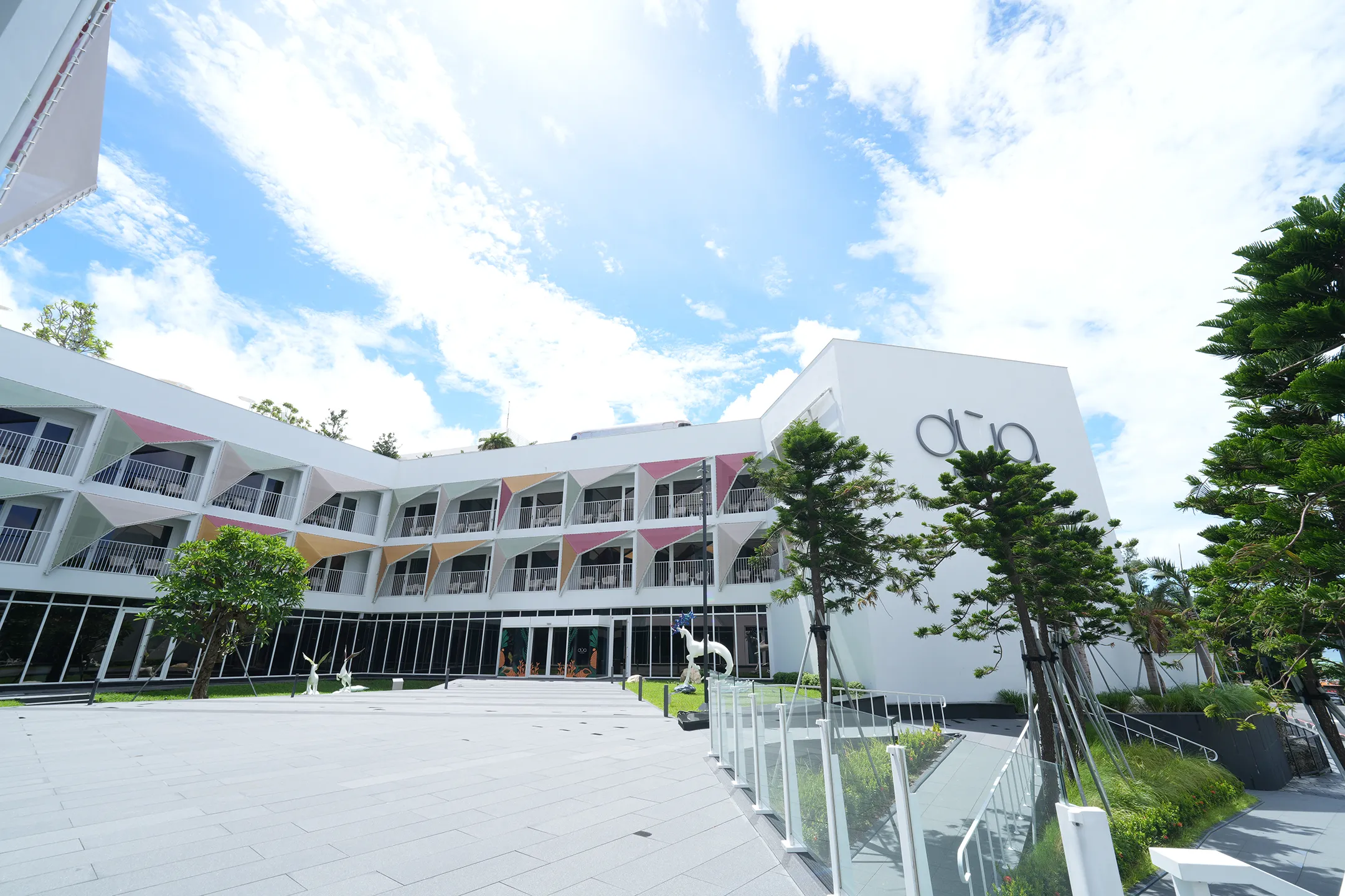 ▼整棟建築以純白色為主體,外牆線條俐落簡潔,展現濃厚的現代感與度假風情。建築外側的陽台以幾何三角形遮陽板妝點,配上粉紅、橘黃與薄荷綠等柔和色系,增添了活潑的氛圍。